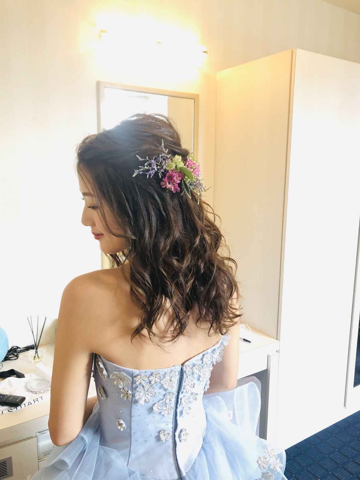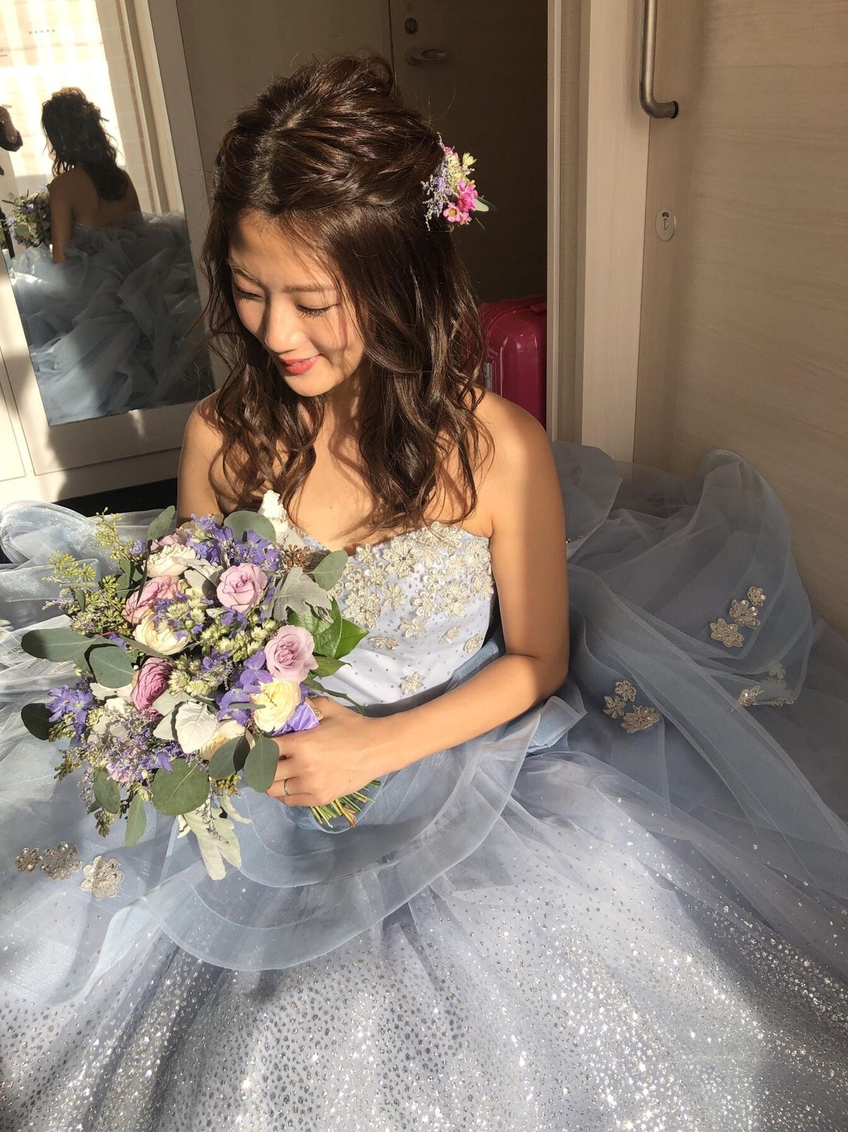 カラードレスでは水色だったのでドライフラワーで色味をなるべく抑えて、でもボリュームをだしてもらいました。