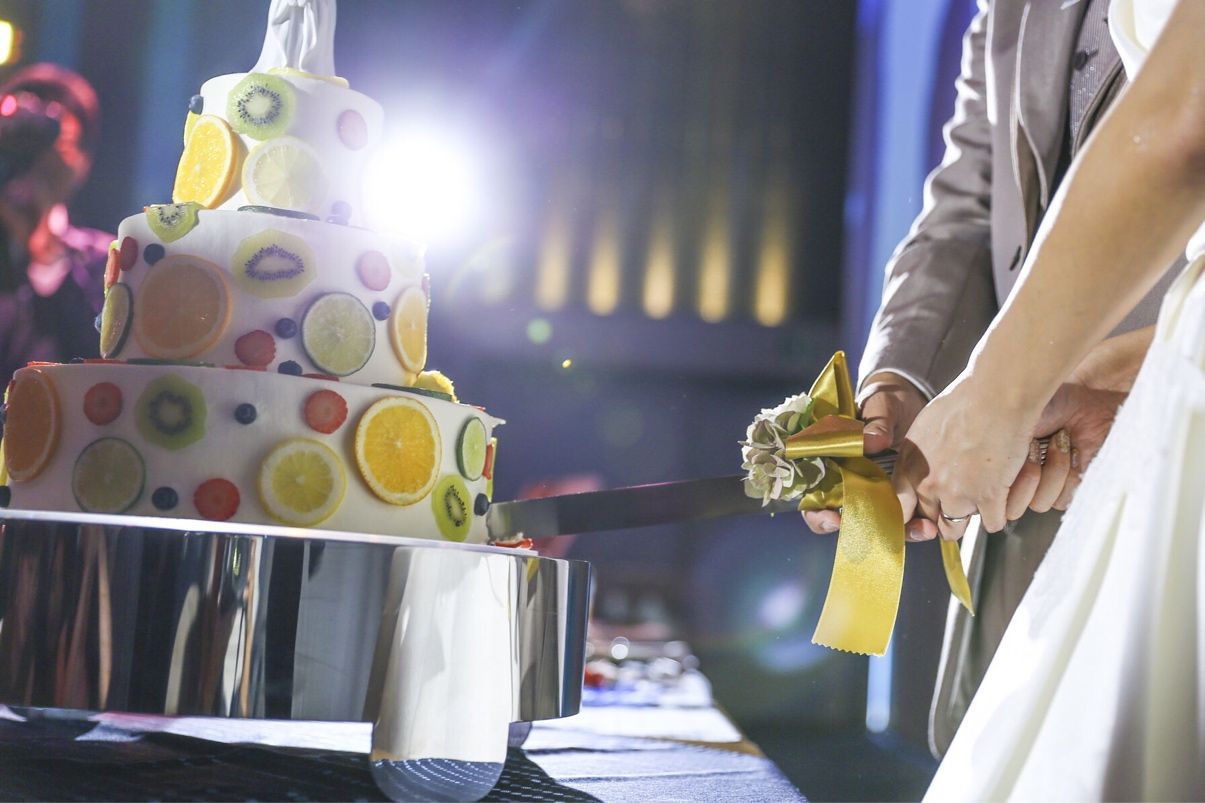 断面にたくさん旬のフルーツを盛り付けてもらい、私たちらしいケーキトッパーをつけたかわいらしいケーキにしました。