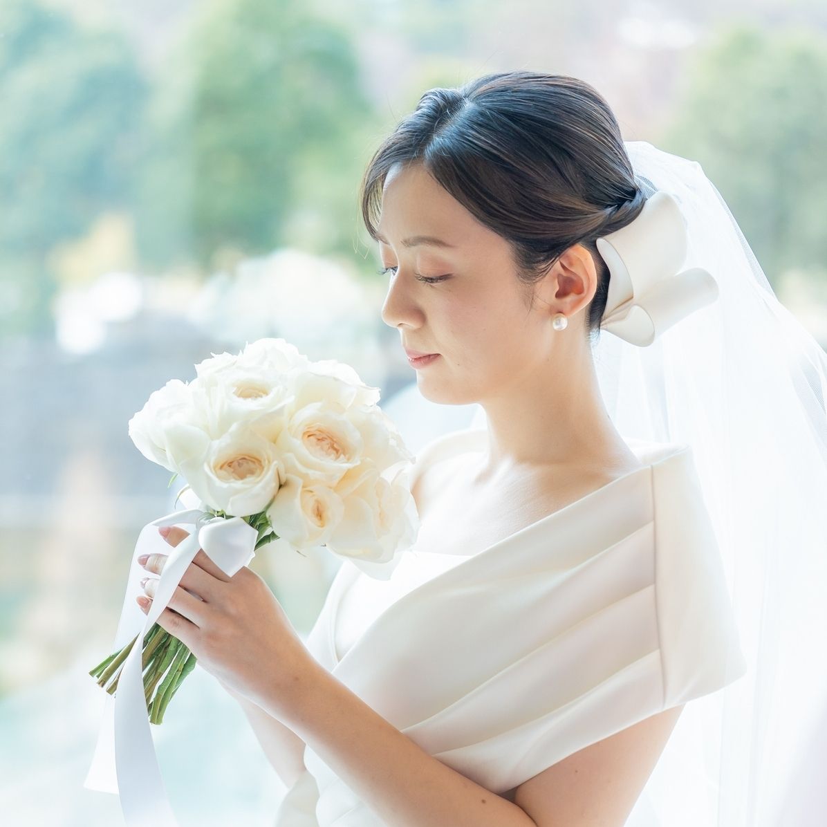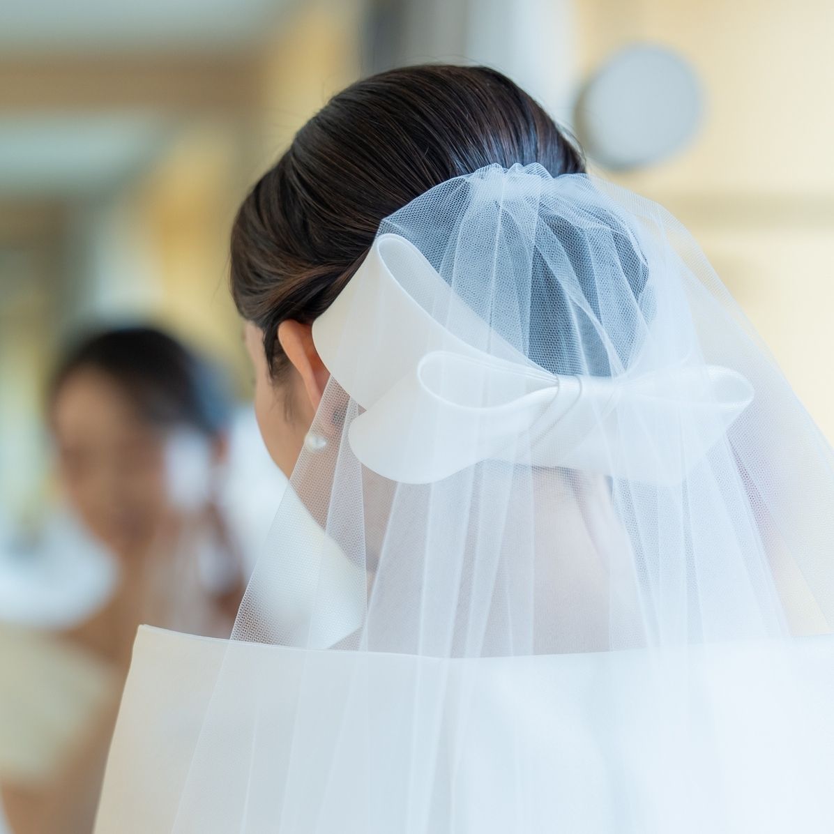 挙式の際は後ろ姿が写真に残ったり、ゲストに見てもらえるので、シニヨンの下につけられるリボンボンネがぴったりでした。