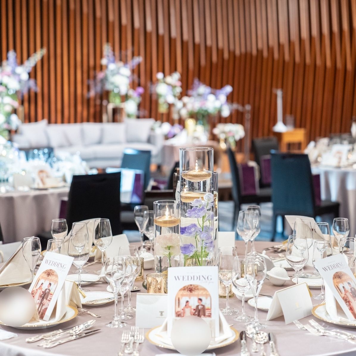会場の装花のイメージはクラシカルに、カラーはホワイト・ラベンダー・濃淡ピンクで、ピンクは濃すぎないようにしてもらいました。