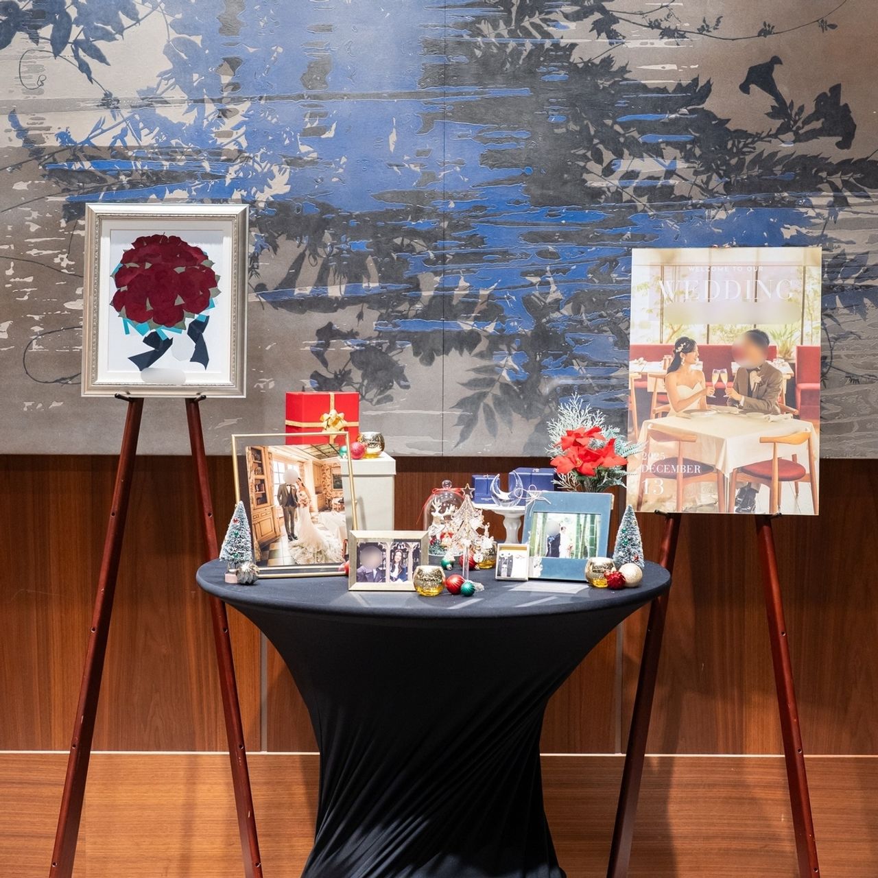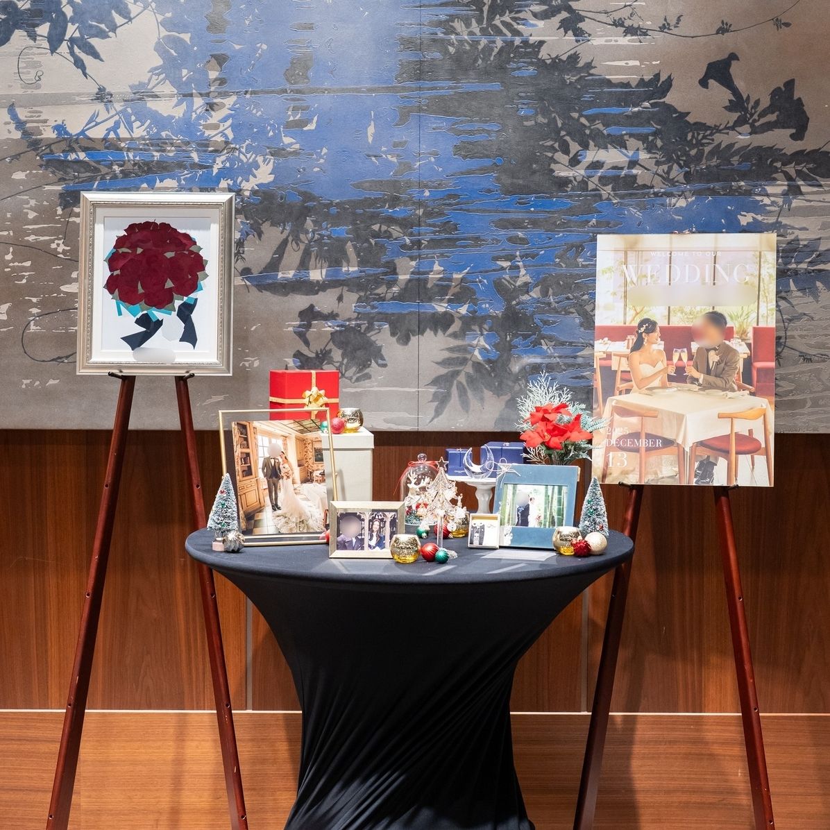 テーマの取り入れ方は、ウェルカムスペースをクリスマスらしくまとめて、披露宴会場ではペーパー類をベロア素材に、ゴールドのキャンドルで冬らしさを取り入れています。