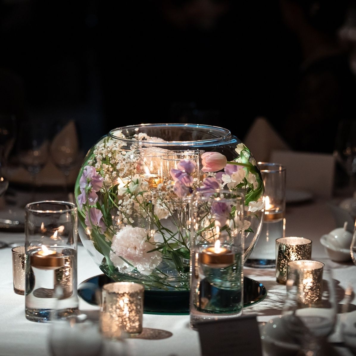 ふんわりと柔らかい雰囲気でまとめていただくようにお願いしています。冬らしさはキャンドルをゴールドにまとめることで取り入れています。