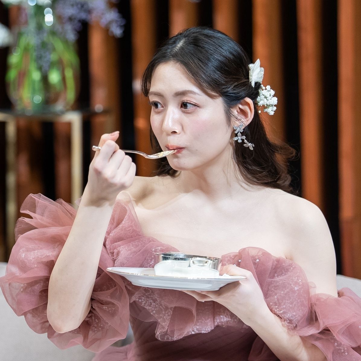 生花をヘアアクセサリーとしてつけられる機会はあまりないので、取り入れて良かったです!