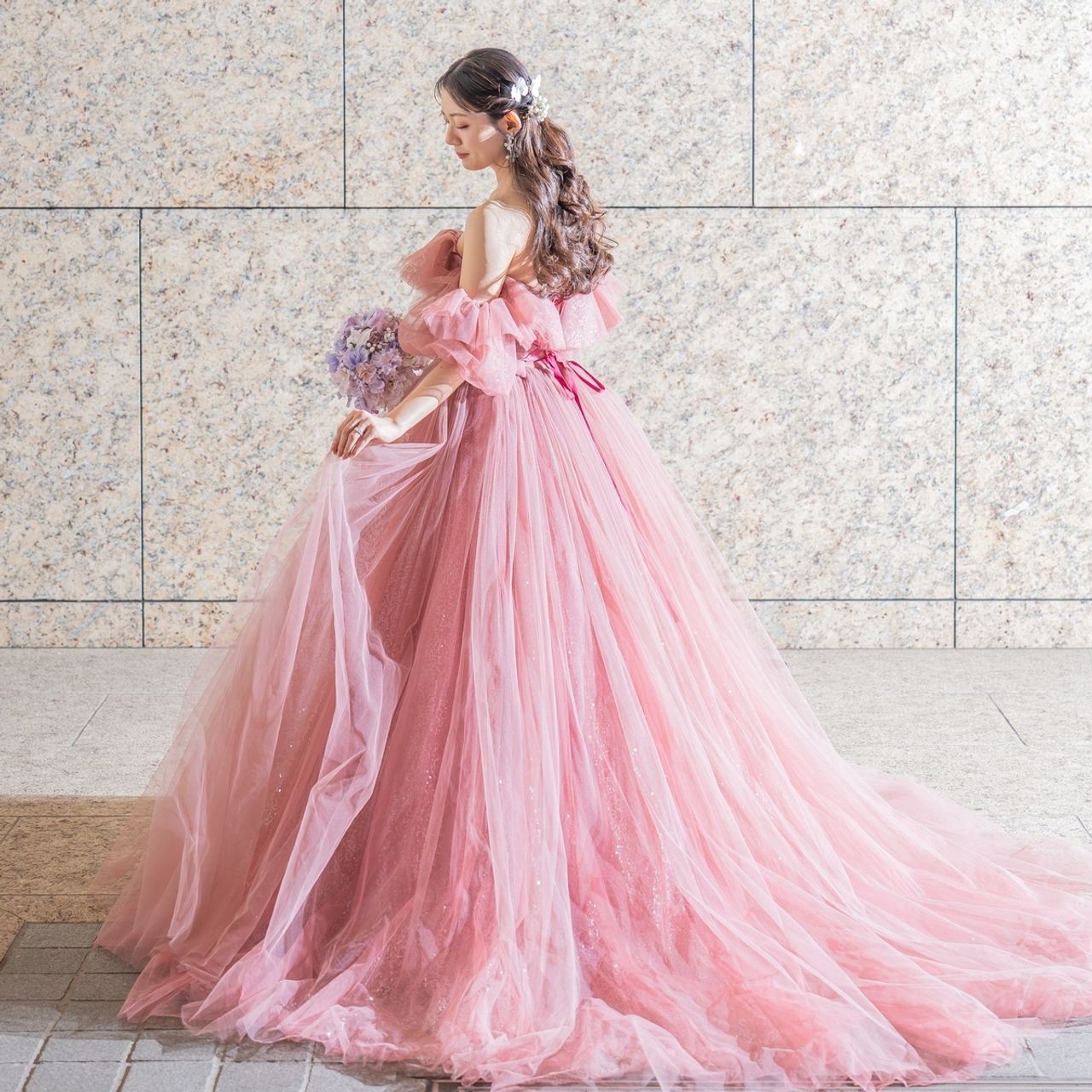 また、大人っぽく温かい色味のピンクで季節にも合って、ウェディングドレスと全く違う雰囲気に変えられます。