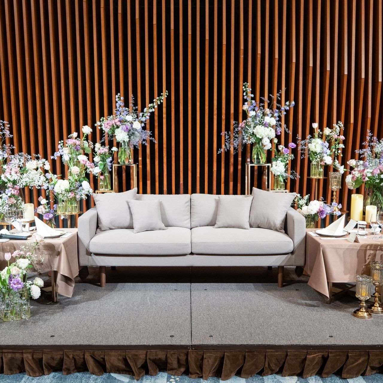 ブラウンの壁が上品な雰囲気で、装花が映える上質な大人の空間を演出できました。