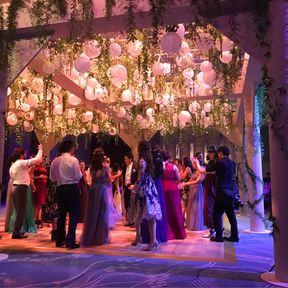 大きなダンスフロアの藤棚もオーダーメイドし、ニューヨークの夜公園で行われた晩餐会をイメージし装花をその藤棚にお願いしました。