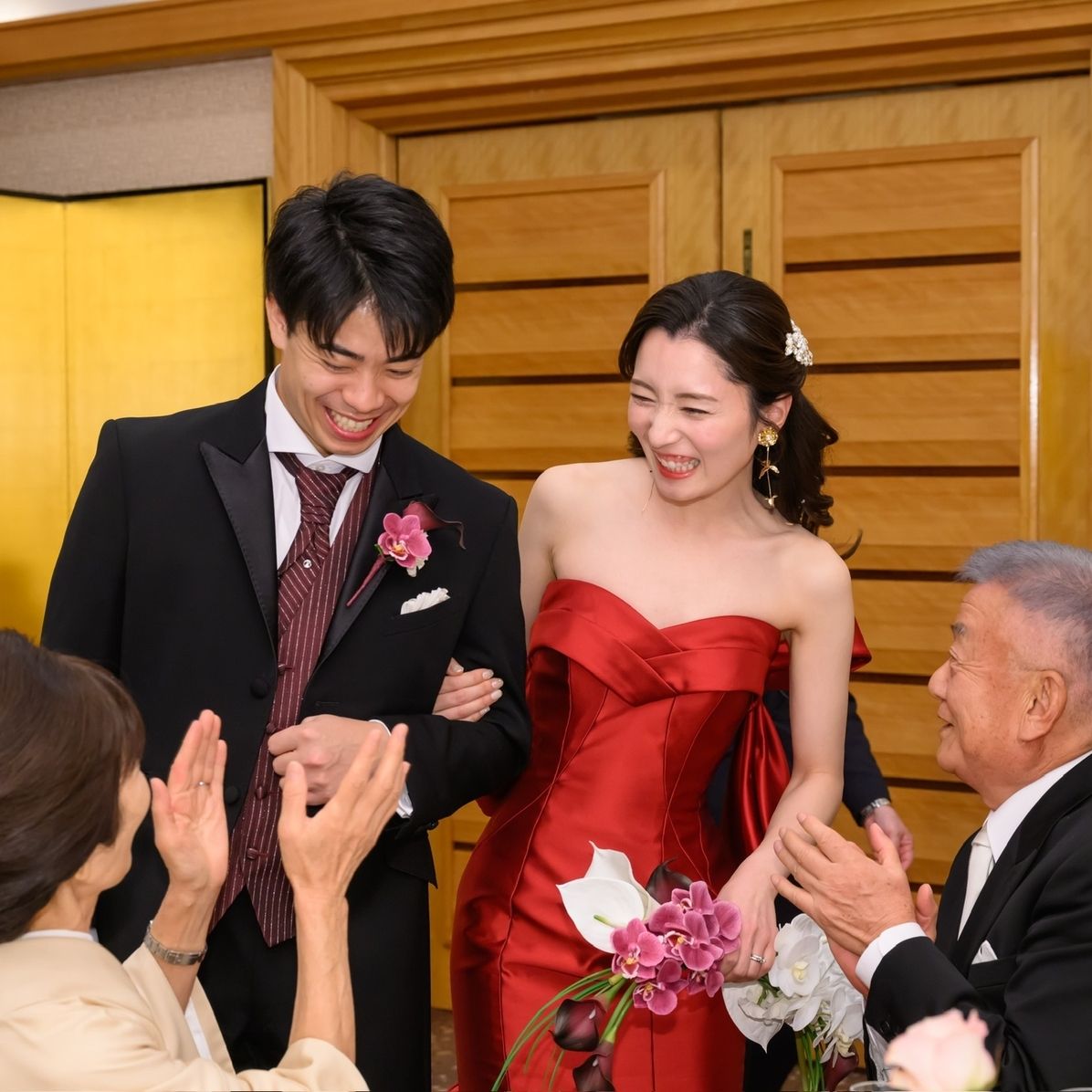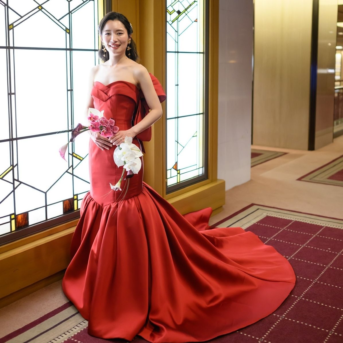 本当は色違いを予約していましたが「主役なんだから」とデザイナーさんに後押しされて赤に決めました!とても華やかで主役感があり、帝国ホテル 東京にぴったりだったので赤にして良かったと思います!