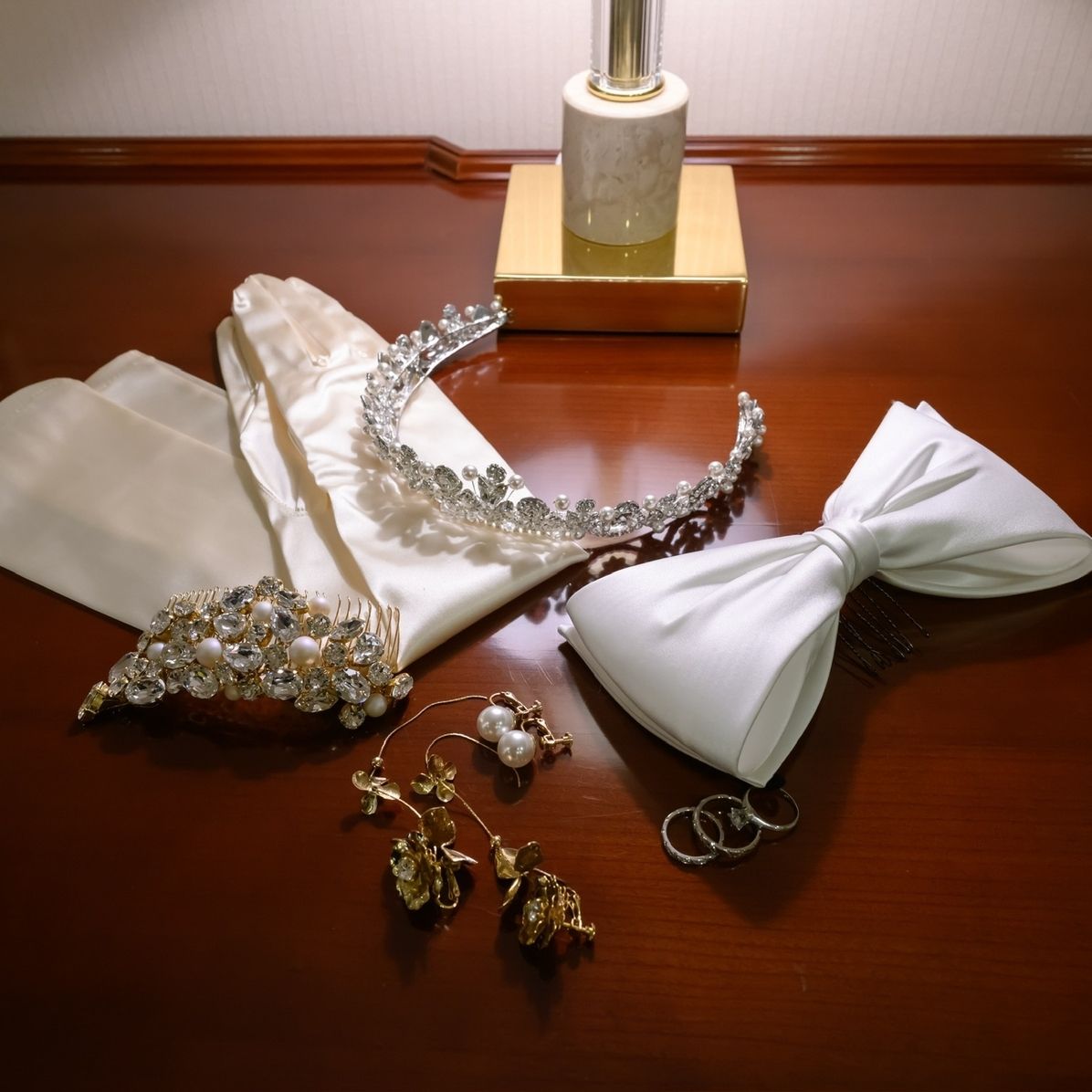 挙式では後ろ姿がメインになるので、桂由美(YUMI KATSURA)ブライダルハウスでレンタルをしたリボンボンネ、披露宴入場ではSAKURAティアラを着用しました。ティアラはパールもついていて華やかさと可愛らしさがあってお気に入りです♡