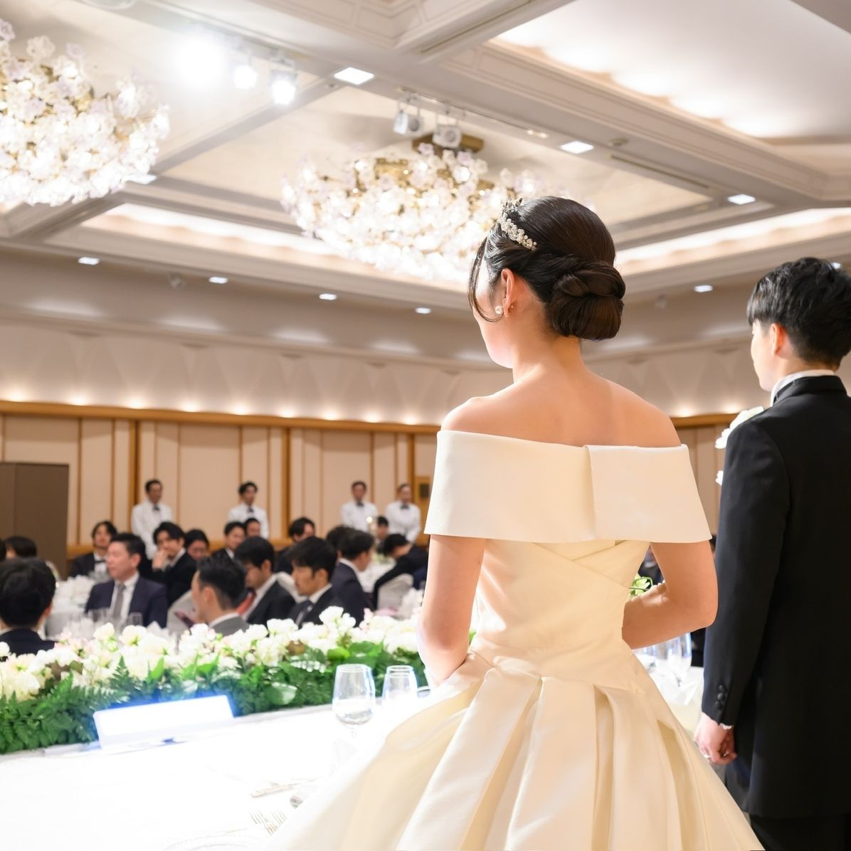 テーマが「王道」だったので、私がイメージしている“ザ・ウェディングドレス!”というデザインを選びました。また、インペリアルタックは帝国ホテル 東京での婚礼限定というところにも惹かれました!