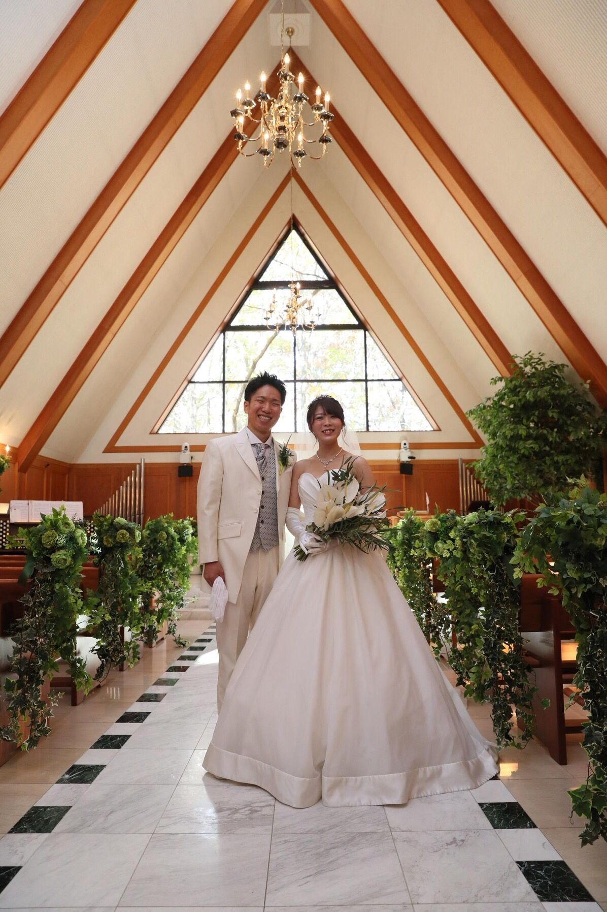 森の中のイメージでやりたかったので、森のチャペルであげました!バージンロードの長さも丁度良く、披露宴に呼ぶ人もみんな入れる大きさのチャペルでした。パイプオルガンと生歌で、歌のリクエストも聞いてくれました。