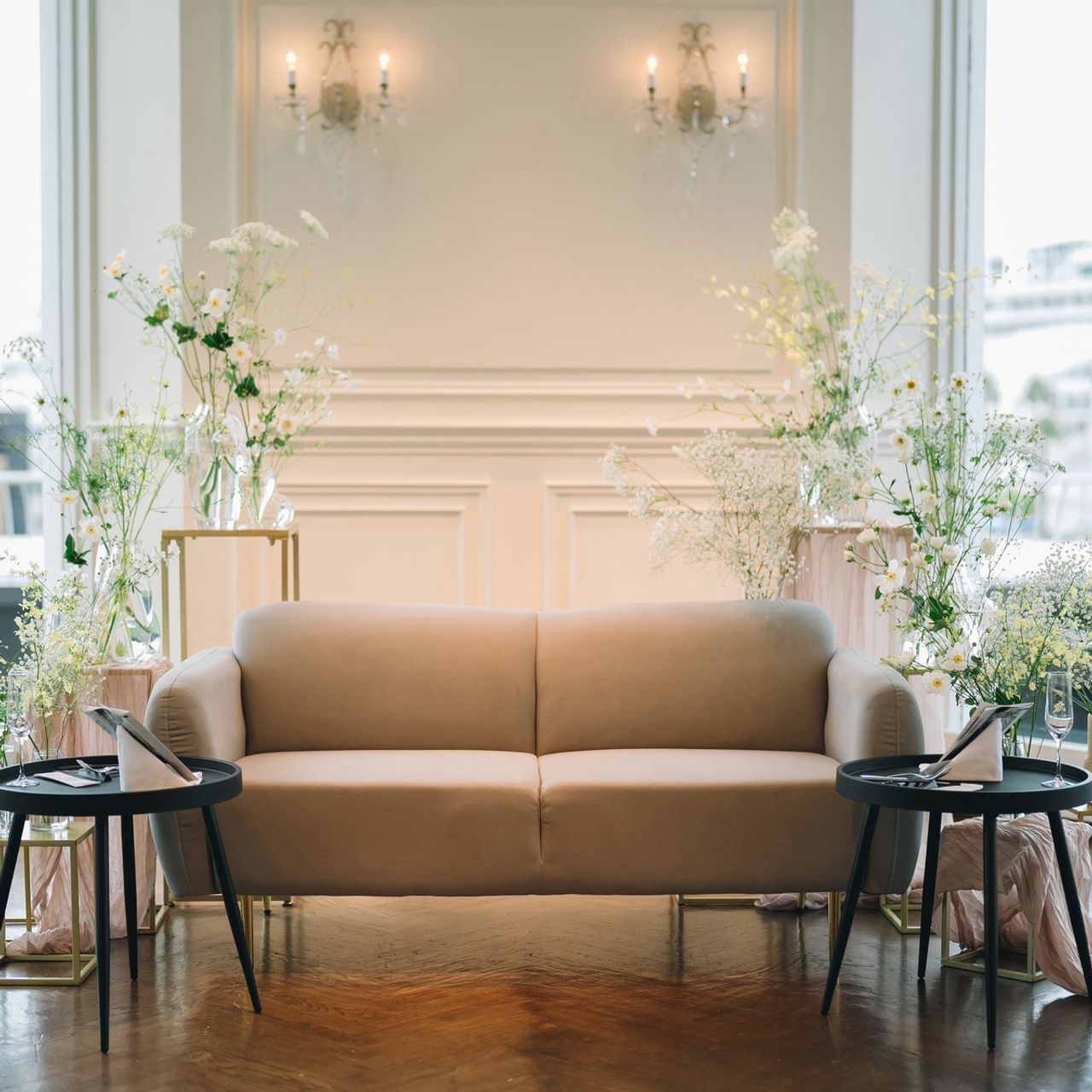 高砂は、椅子やテーブルの種類を選べるなかで、ソファーとサイドテーブルを選択したことで、ゲストと写真を撮る際にドレスの足元までしっかりと残すことができました。