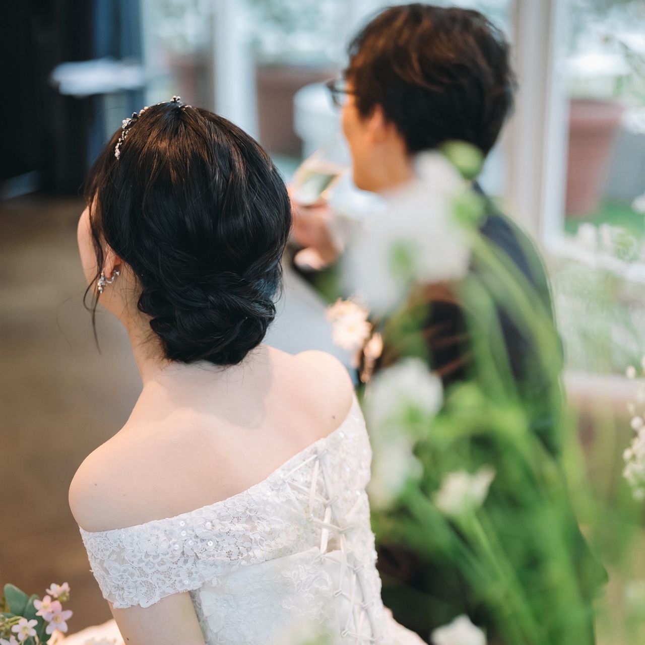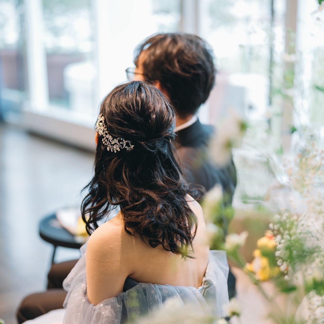 アップスタイルではシニヨンにまとめてもらい、ダウンスタイルはくるくると巻き、より華やかな印象になるハーフアップに仕上げてもらっています。