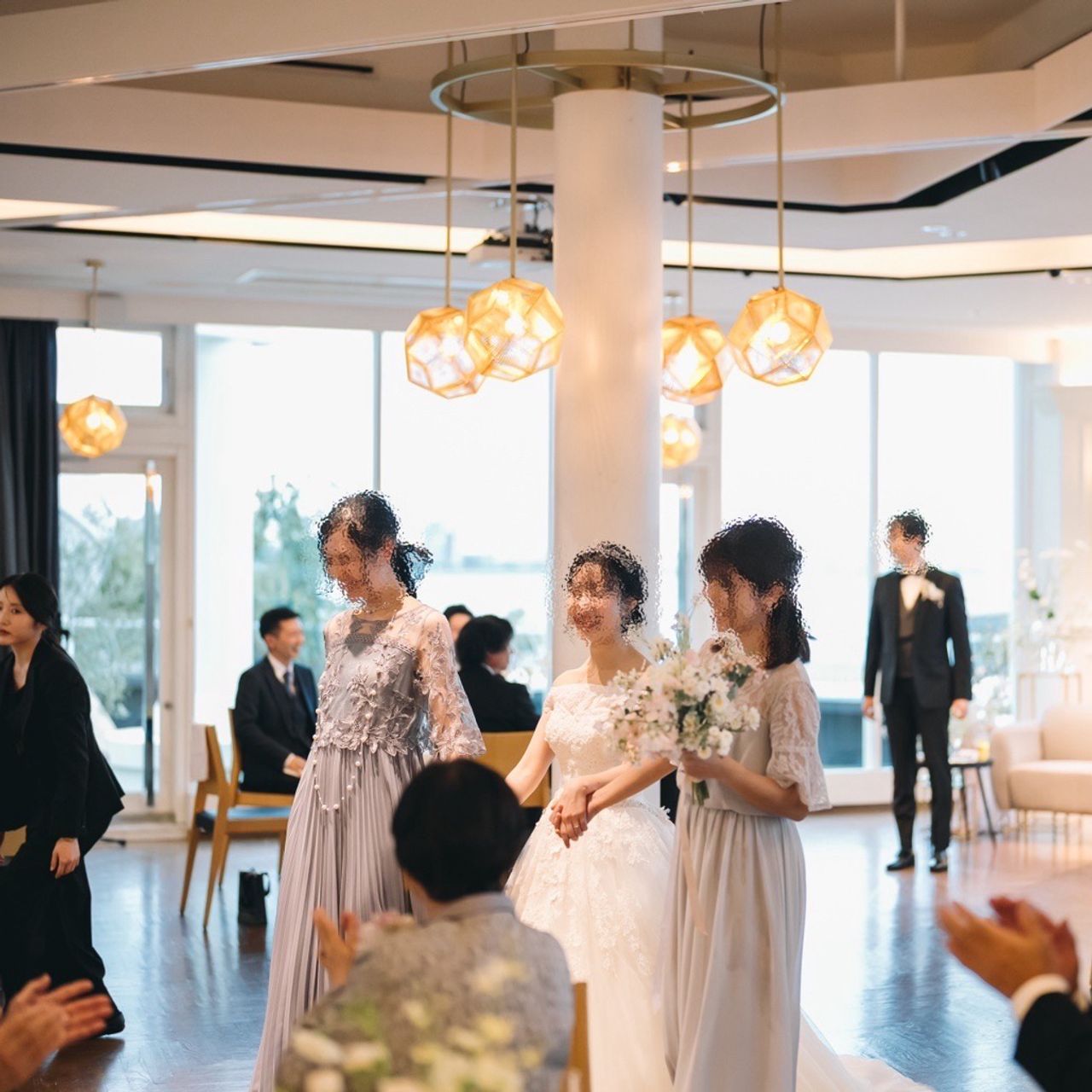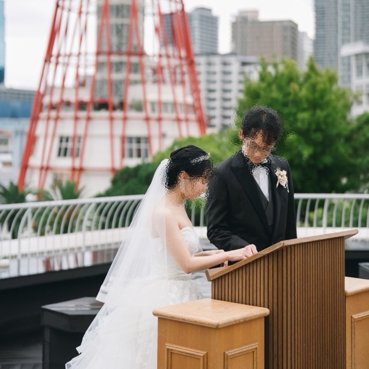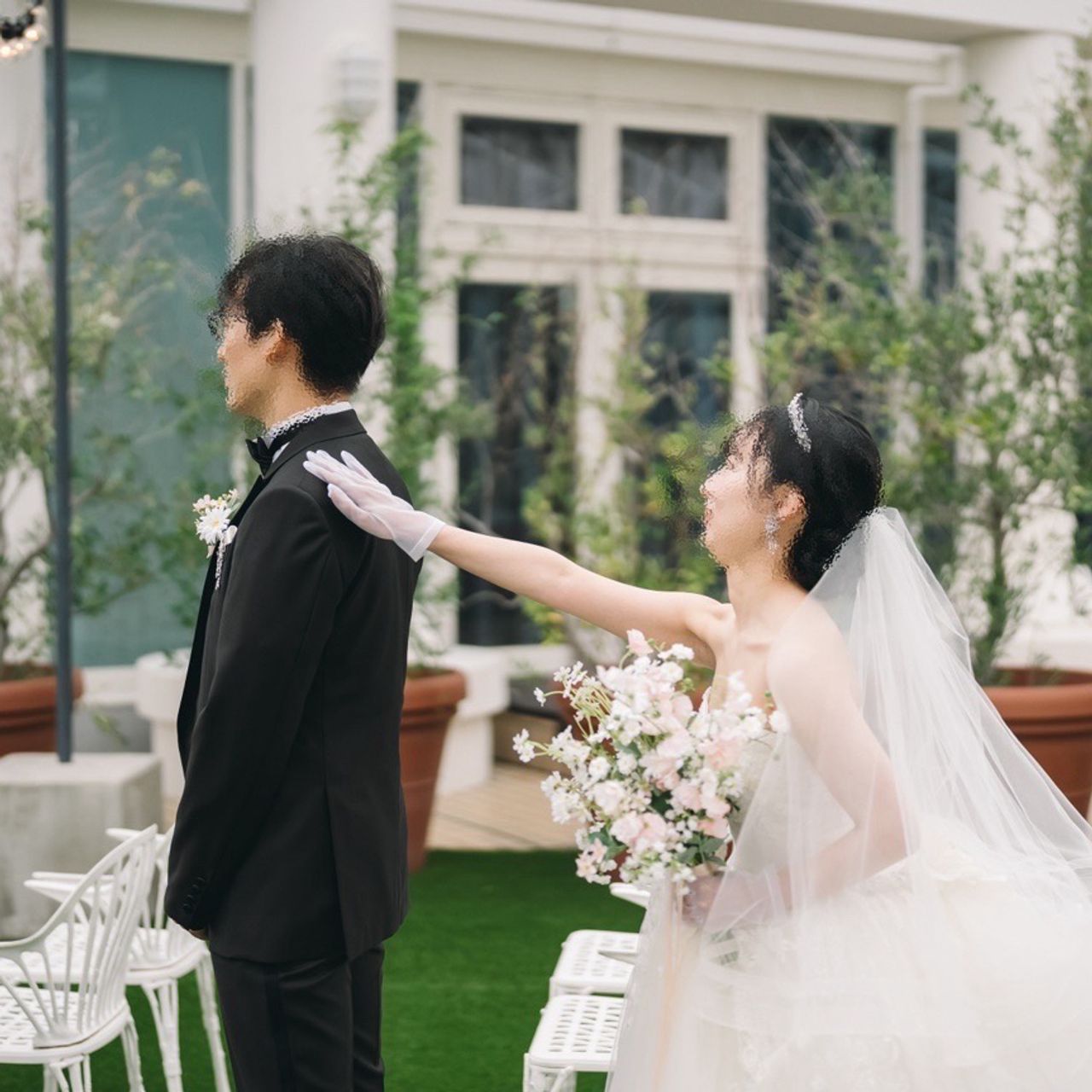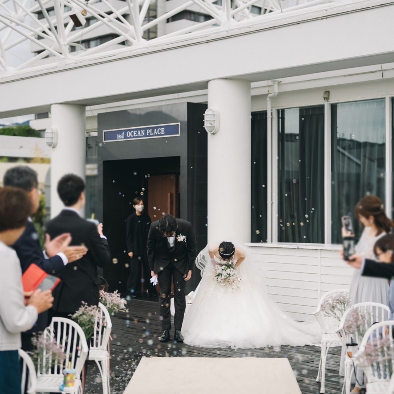 雨が止んだ瞬間にプランナーさんがすぐテラスの準備を進めてくださり、そのおかげで屋外ならではの開放感を感じながら挙式の時間を楽しむことができました。