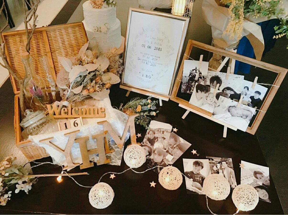 私たちの前に他の方の披露宴があったので、当日ウェルカムスペースの飾り付けはスタッフの方がしてくれました。予行のためにわたしたちが前日に飾ったのと少し違ったのが心残りです。飾り方など細かくまとめた指示書みたいなものを作ればよかったなと思いました。