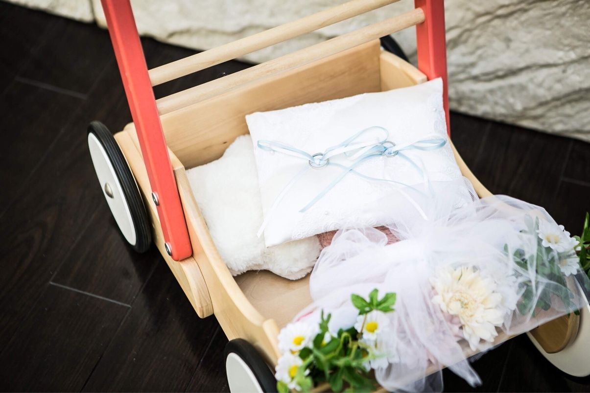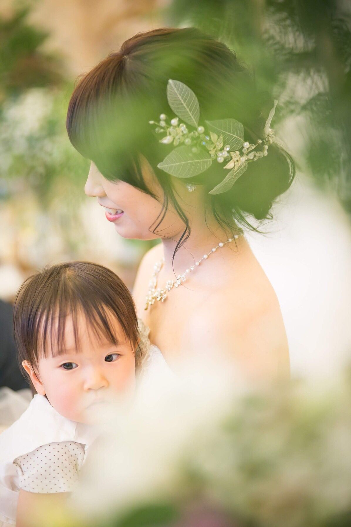 リースブーケはカラードレスのときに絶対に持ちたいと思っていました。打ち合わせのときは特に意識していなかったのですが、肘にリースブーケを掛けていれば両手で子供を抱っこできたのでよかったです!
