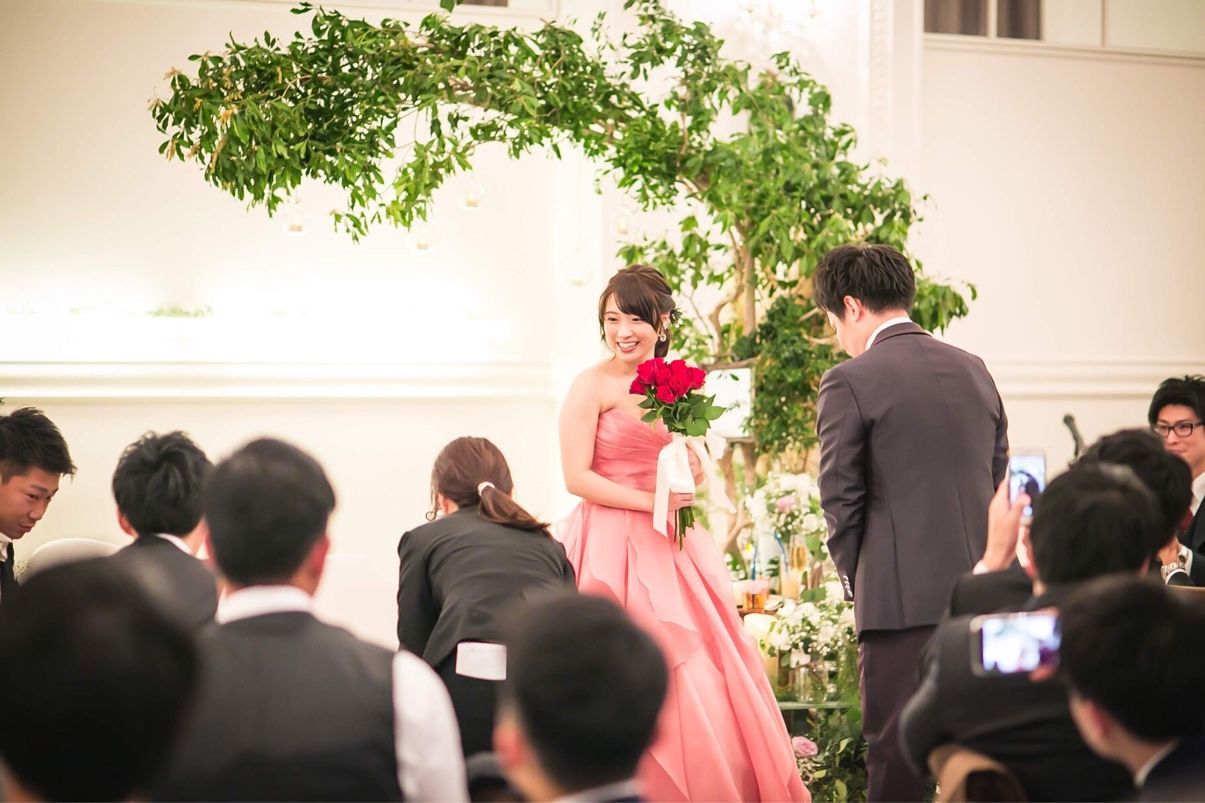 披露宴で再入場したあとにプロポーズとバラの花束をもらったことに感動しました!
