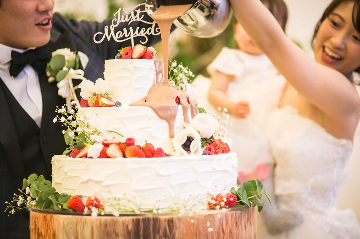 娘にリングガールをしてもらったり(泣いてしまったのですが)、娘もずっと高砂にいられるようにソファにしたり、ケーキの演出も一緒にできるように、カットは難しいと思ったのでドリップケーキにし、ファーストバイトも娘を交えて3人で行いました。