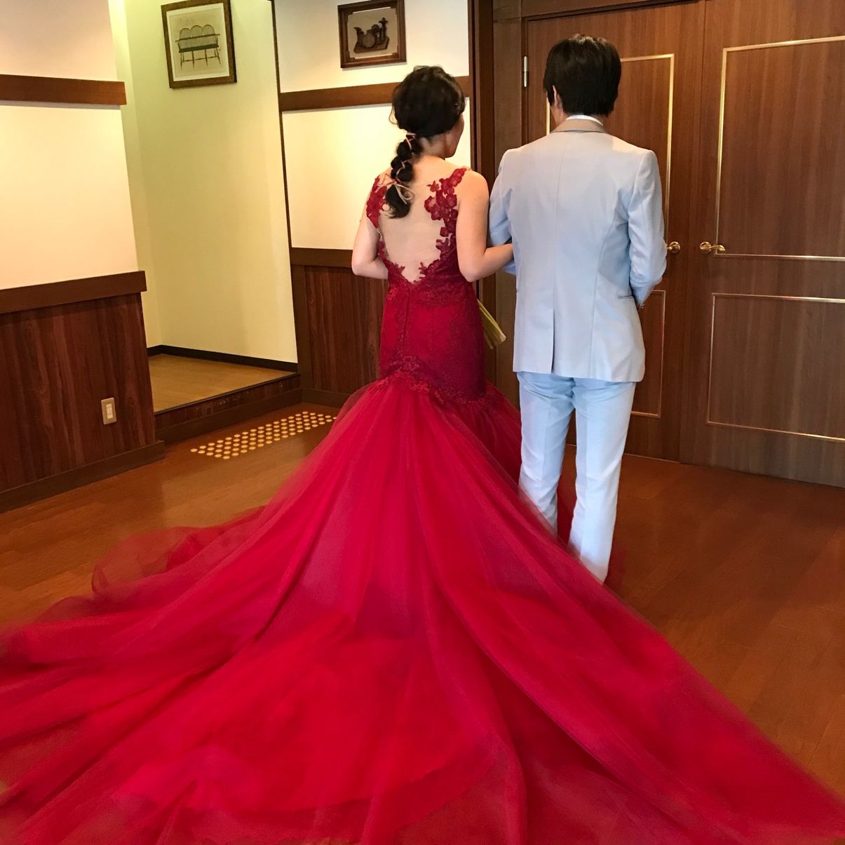 会場の提携先(Vieux Paris)オリジナルドレスのマーメイドドレス(赤)を選びました。背中が空いていて両サイドに縦に刺繍ラインが入っているのでスタイルアップしてみえるところや、腰から下のチュールがとても可愛くて一目惚れしました。