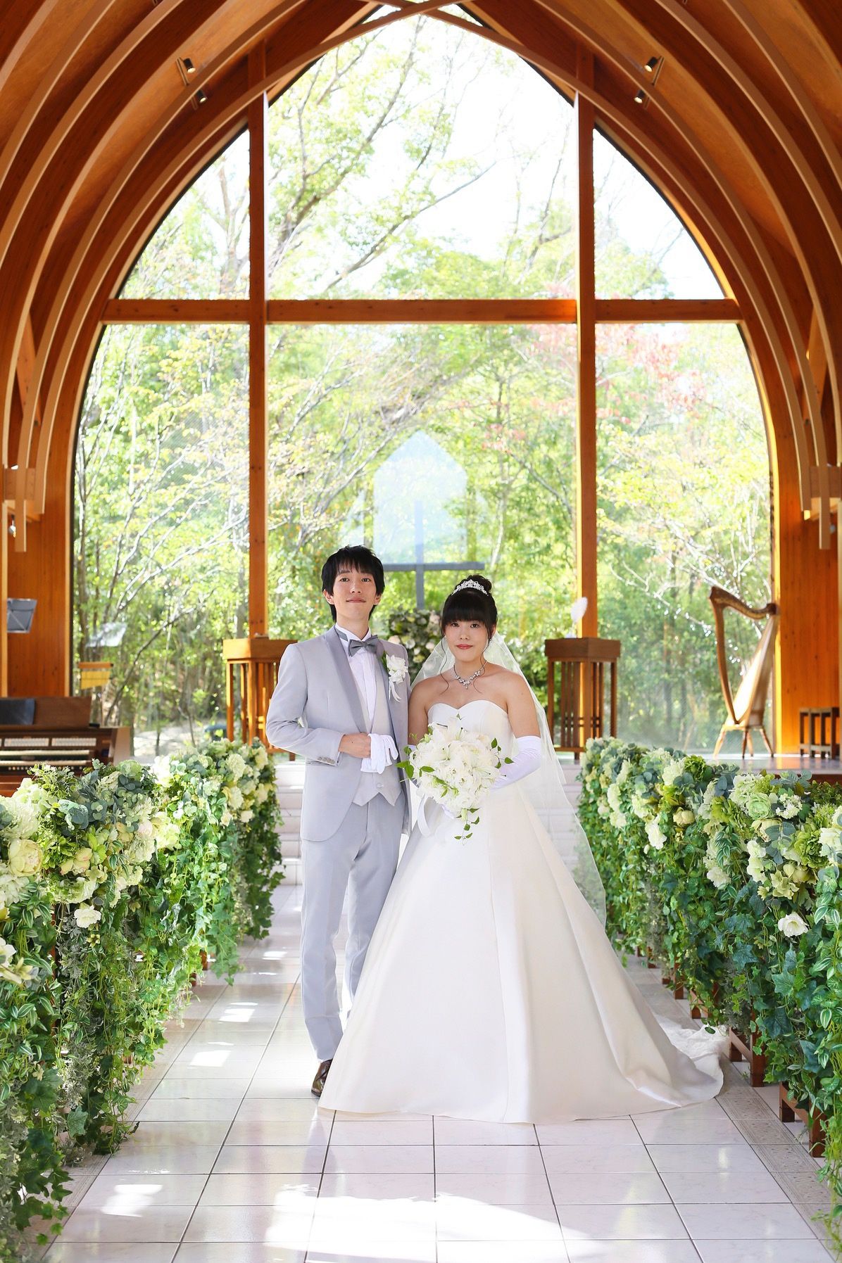 木のチャペルは天井が高くグリーンがたくさんあるので、日の光が差し込んでとても綺麗です。木漏れ日も感じれるので、本当に森の中にいるような気持ちになります。