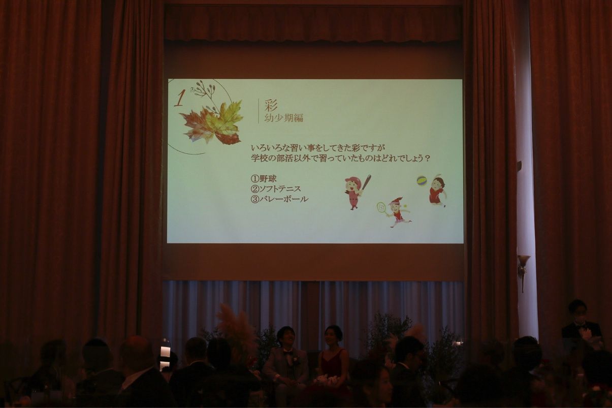 新郎新婦クイズは、2人の恋愛的なものではなく、友達や家族だからこそ知っているそれぞれの性格や周りの環境を考えて答えを当てるようにしたので、みんなに楽しんでもらえたと思います。(小学校時代の習い事はなんでしょう?等)
