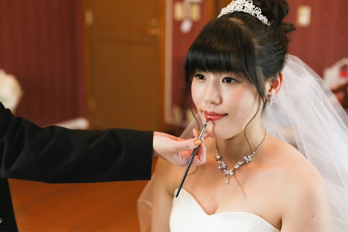 お色直し後のマーメイドドレスでは、前髪をあげる+後ろで低めにまとめた玉ねぎヘア+紐アレンジをしてもらいました。100均で買った赤とベージュの紐をとても可愛く巻きつけてもらいました。メイクはドレスに合わせてアイシャドウとリップを濃いめにしました。お色直し前後で前髪をがらっと変えたのもあって、印象をがらっと変えることができました。