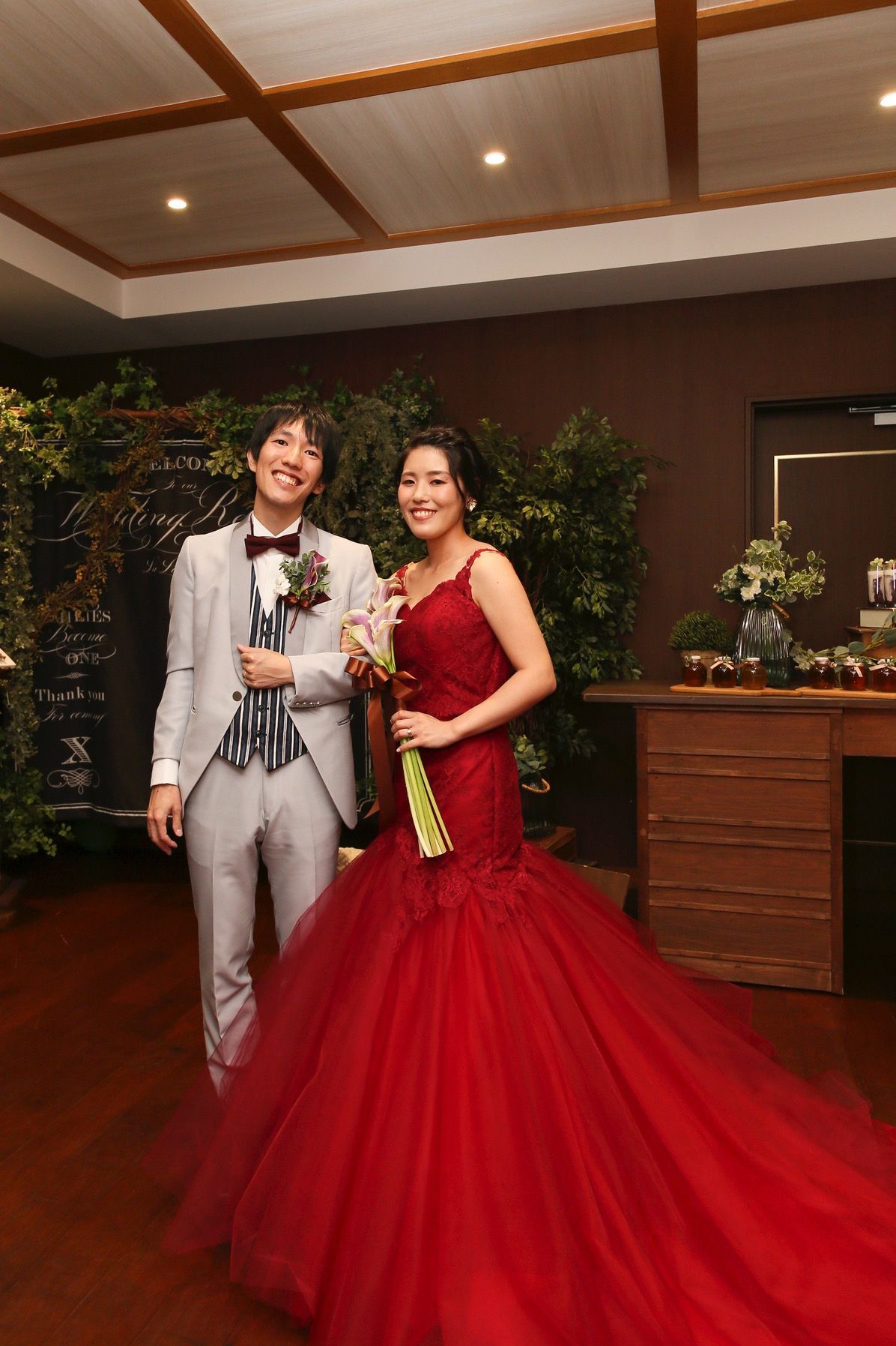 森の中の邸宅のような披露宴会場でアンティークな雰囲気がよく似合うと思ったのと二人ともミッフィーが大好きなので、テーマを「アンティーク×ミッフィー」、テーマカラーを「ブラウン・赤・黒」にしました。カラードレスを赤にし、装花も赤をポイントにアンティークっぽくちょっと霞んだオレンジやグリーンを加えてもらいました。