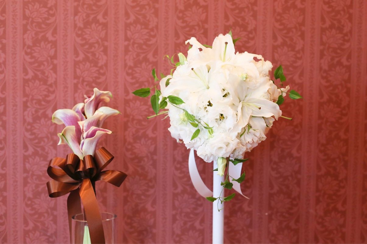カラードレスはちょっと珍しいアームブーケで白×紫のカラー(ピカソ)にしました。とてもお洒落でカラードレスや会場の雰囲気によく合っていたと思います。