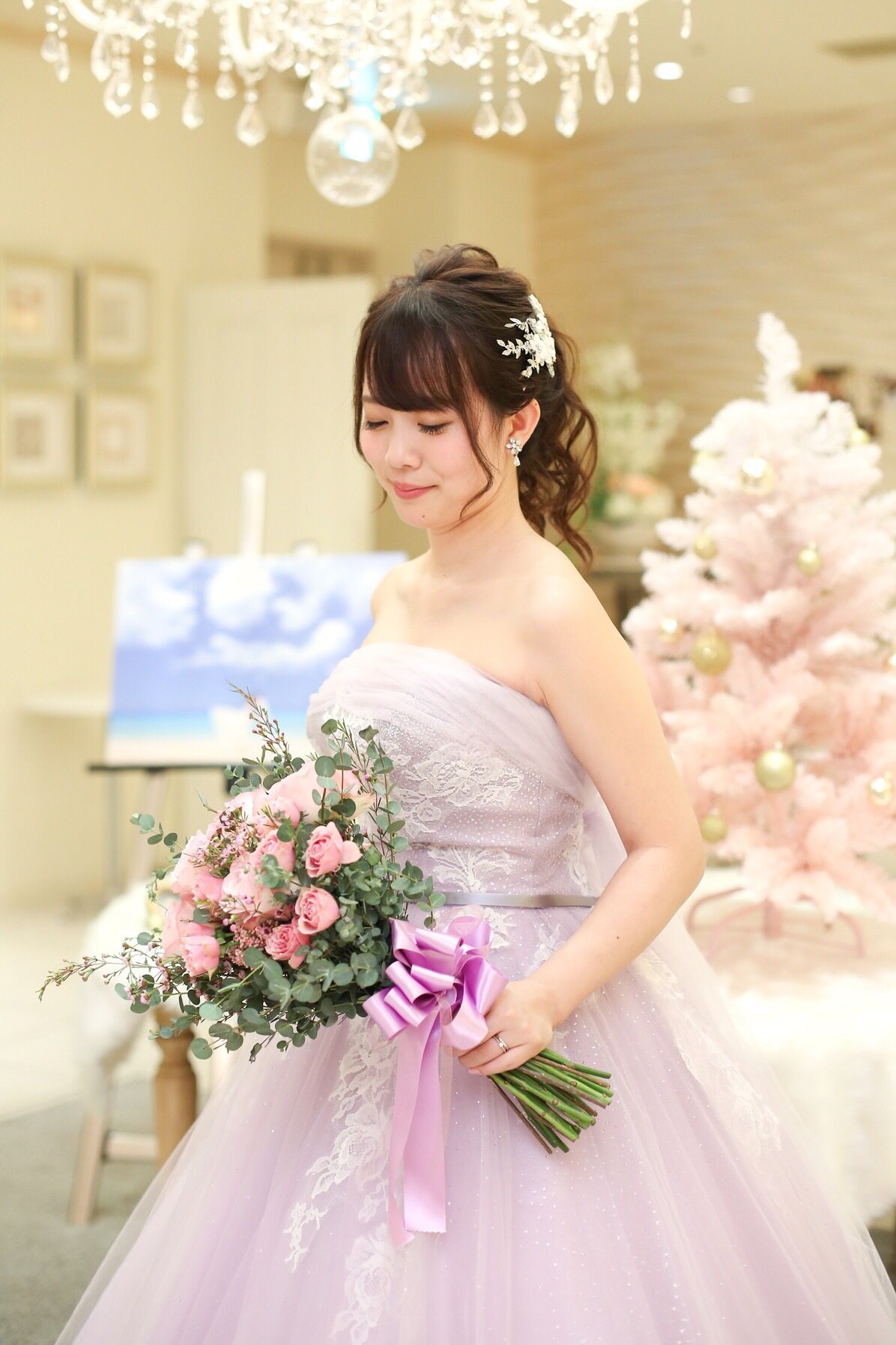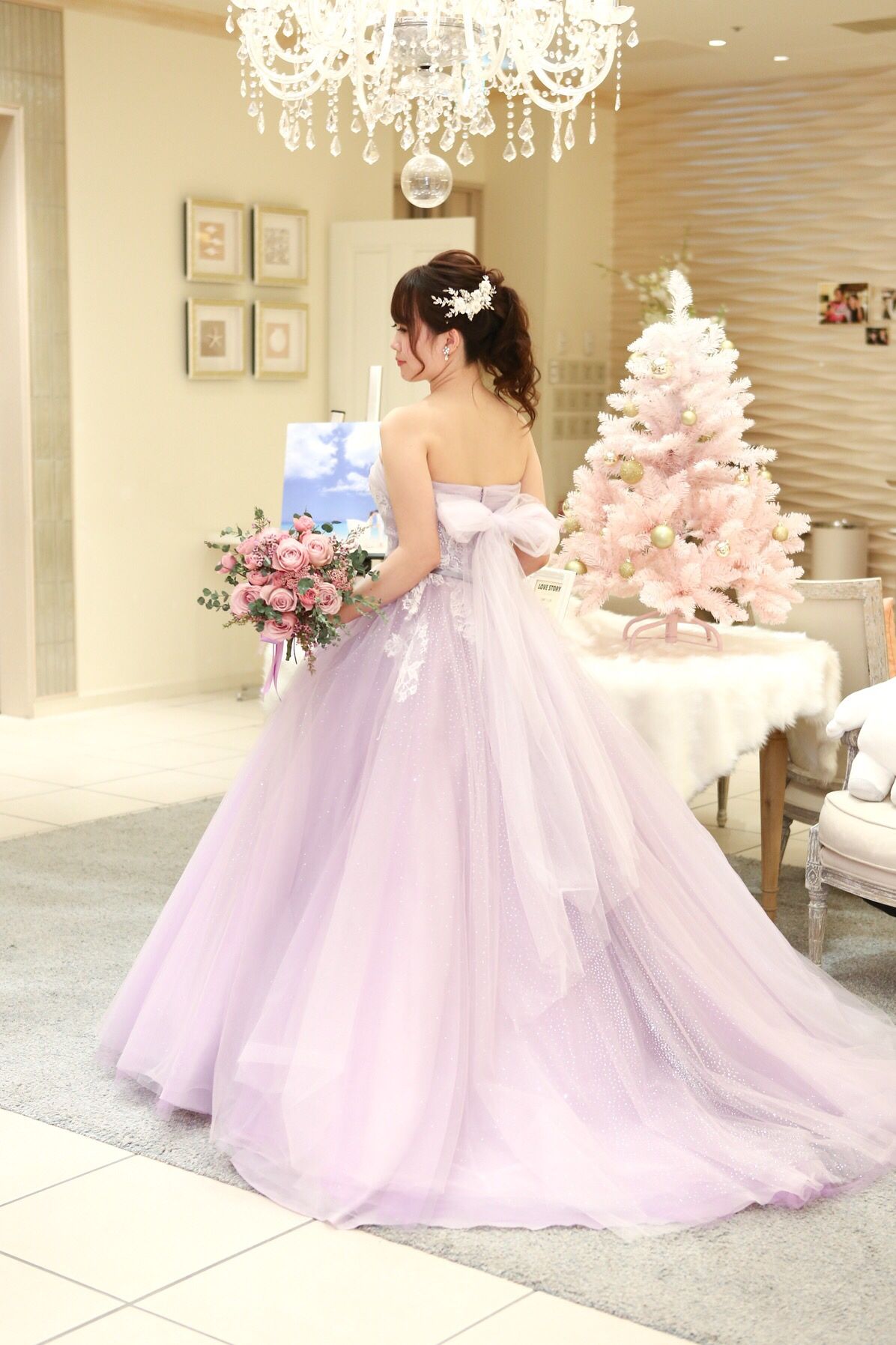 ラベンダーのなかでも特に好きな色味で自分の肌色も明るく見えて、テーマカラーのピンクにもよく映える大好きなドレスです。