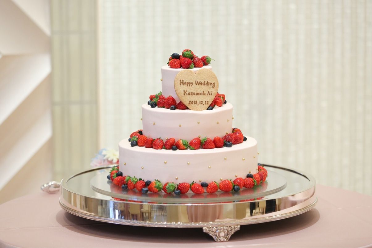 テーマに合わせてケーキもピンクにして、フルーツは大好きなベリー系で、ウェディングケーキらしい形がよくて丸型の三段ケーキにしました。
