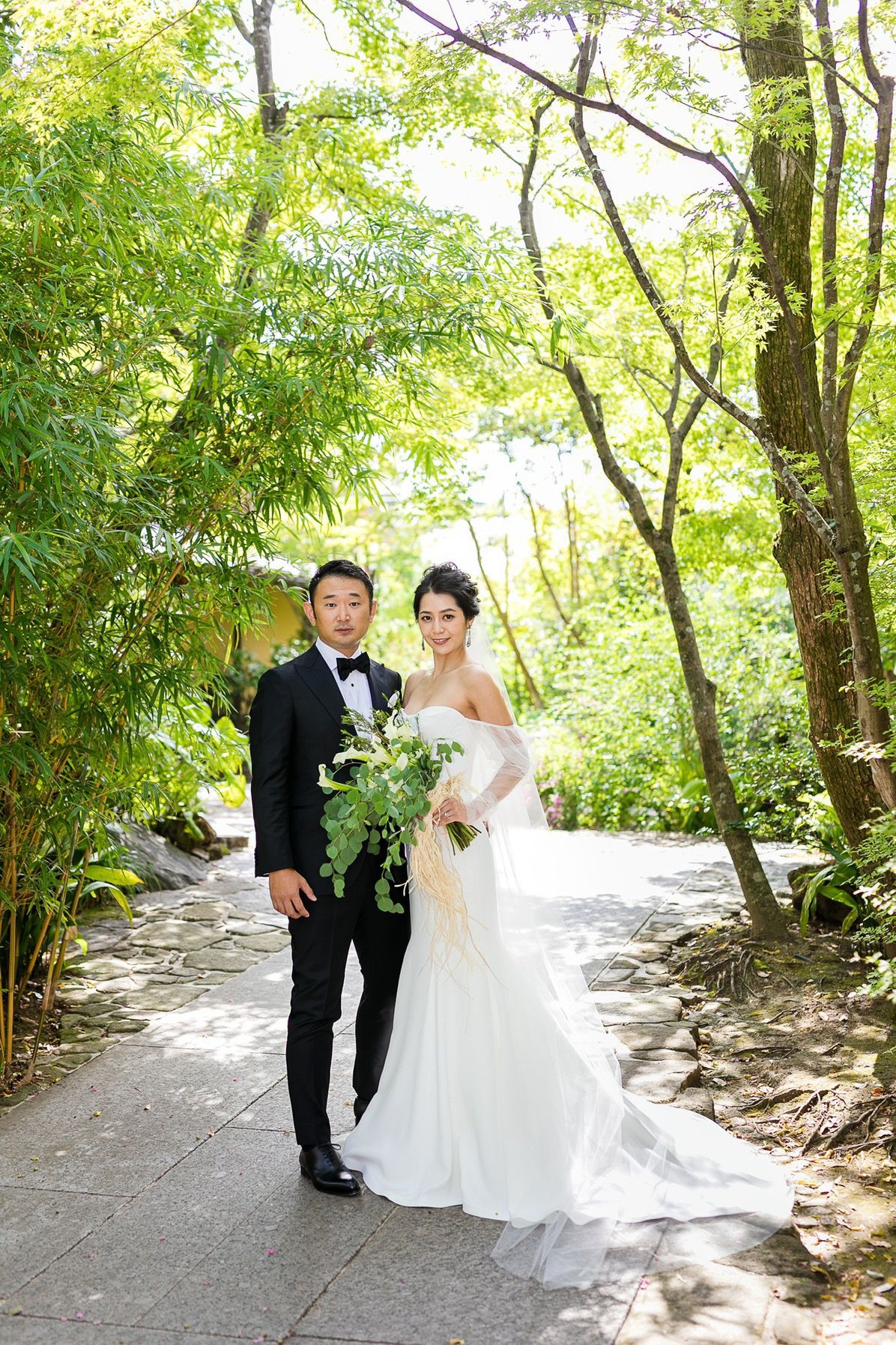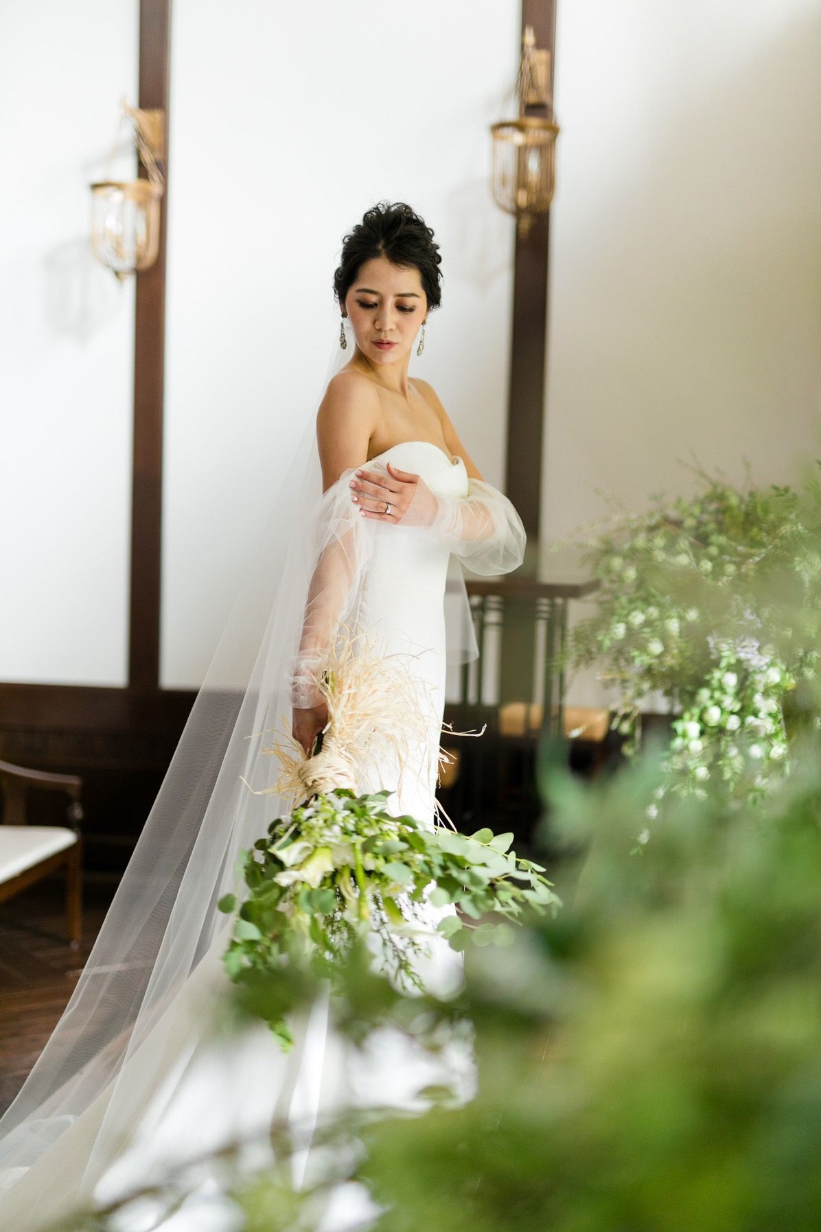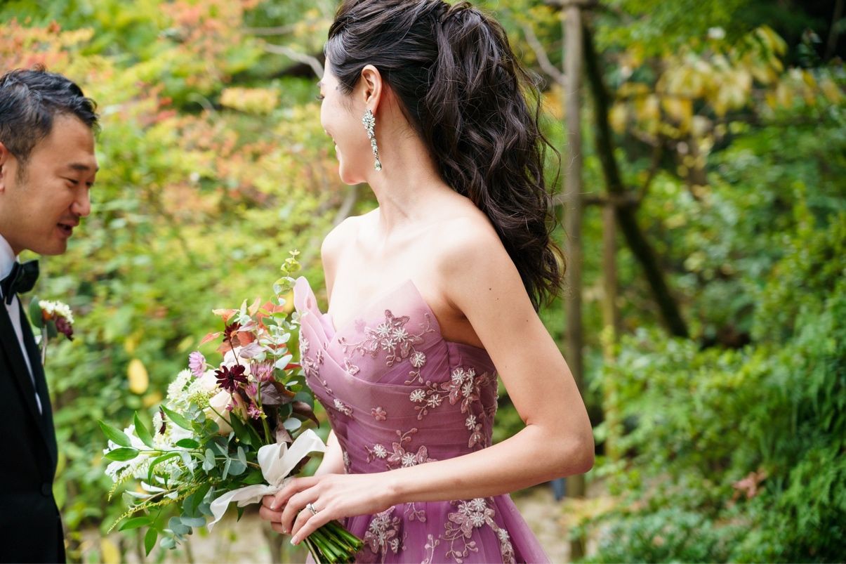 京都ならではの雰囲気と、アンティークな上品さが感じられるところです。光、緑、温もり、音、木が調和し、洗練された会場でした。大きな窓から入る光がヴェールを照らし、より特別感を得られました。