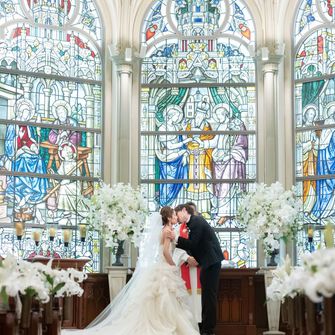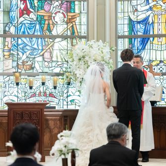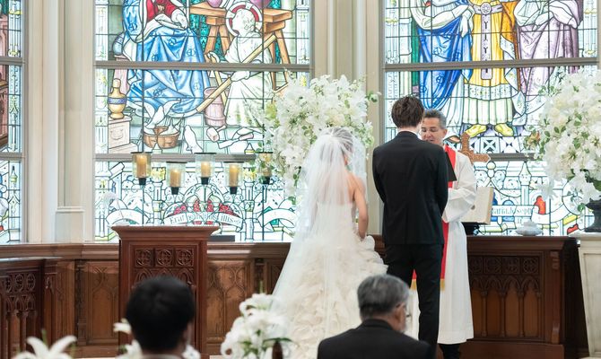 ステンドグラスが素敵な大聖堂の式場で非日常な感じではあるけど、少人数だからこそゲストとの距離感を大切にし、アットホームな雰囲気になるようにしました。
