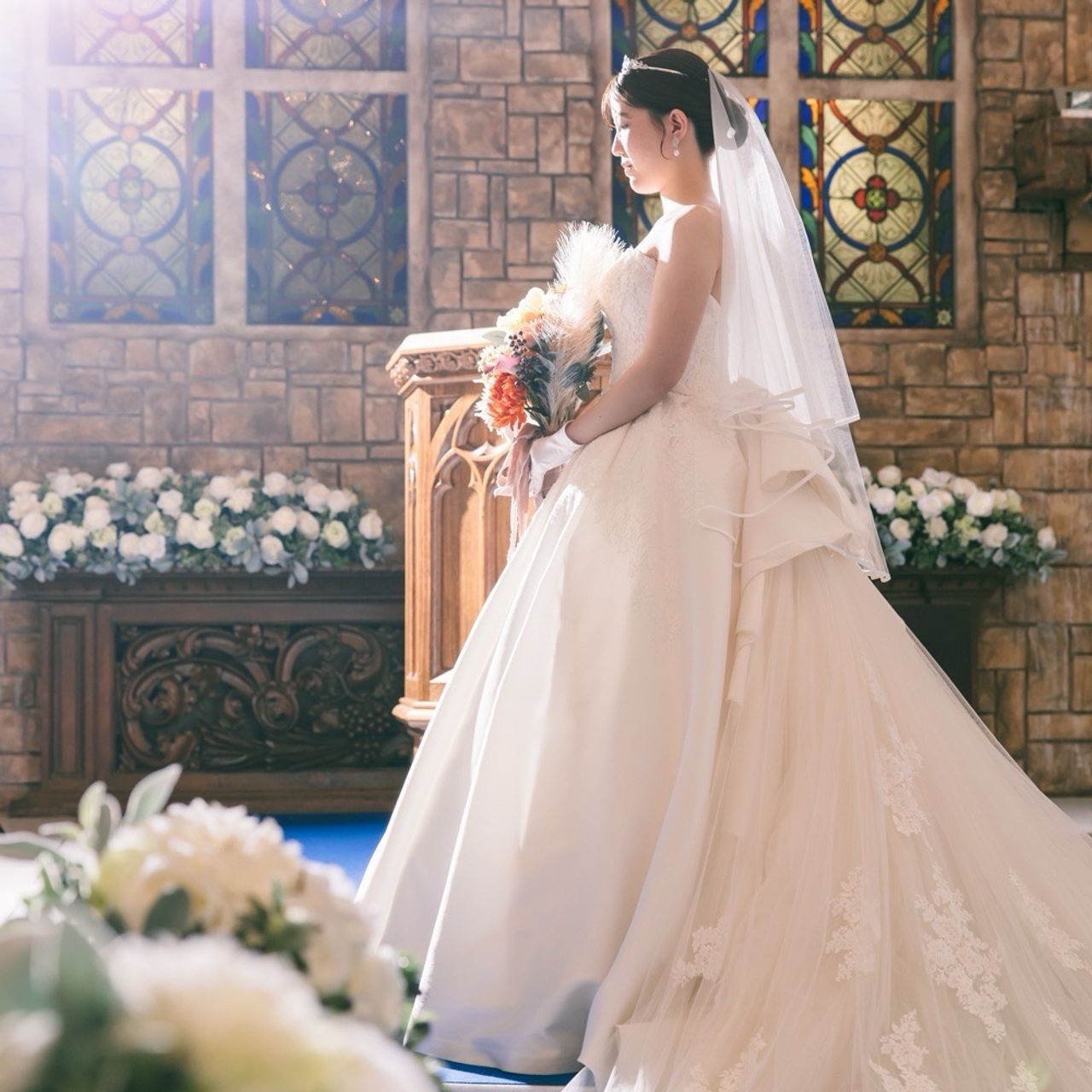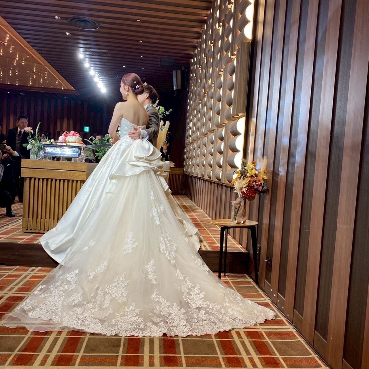 白を基調とした挙式会場が多い中、ここのチャペルは天井が高く、ドレスのバックスタイルがとても美しく映える空間でした。