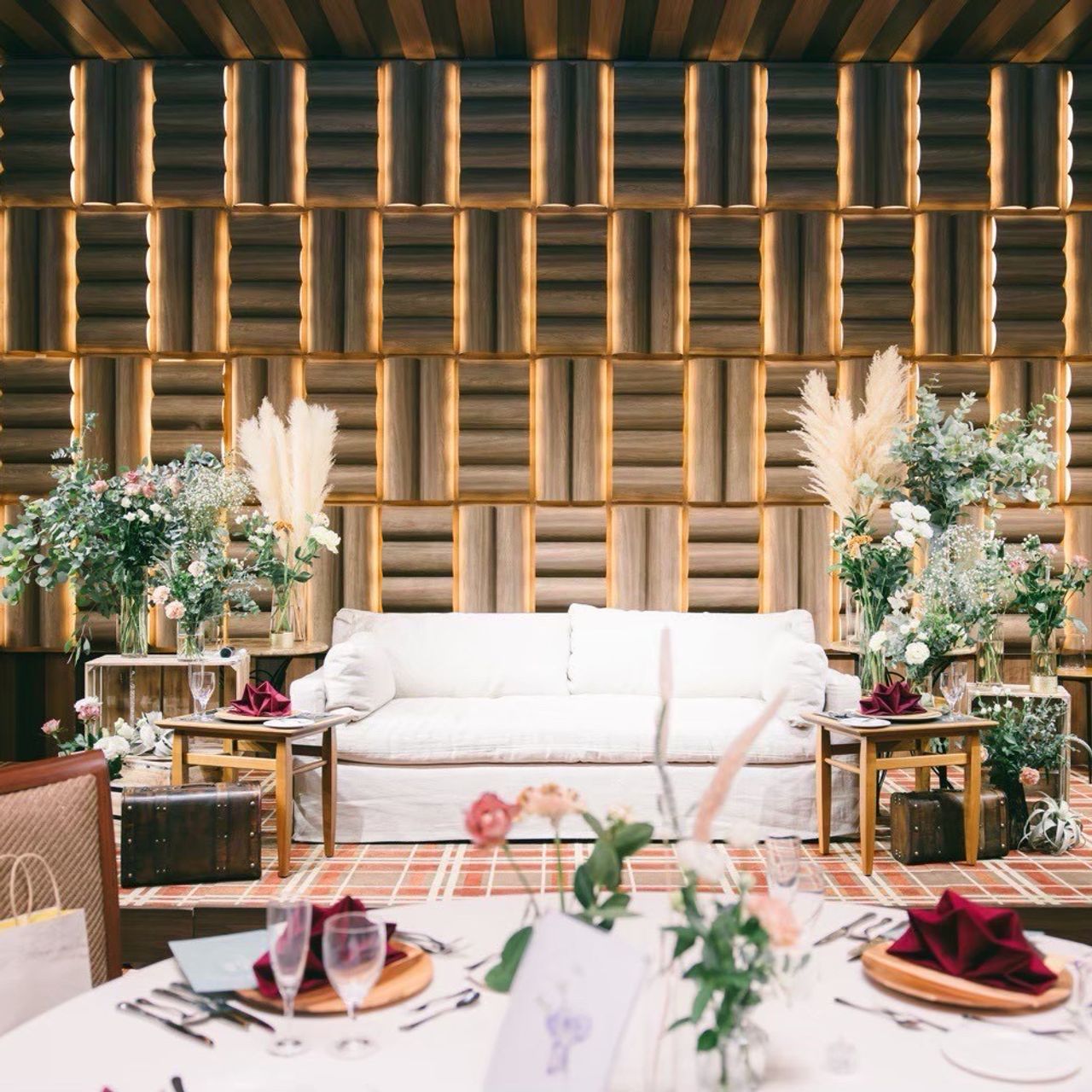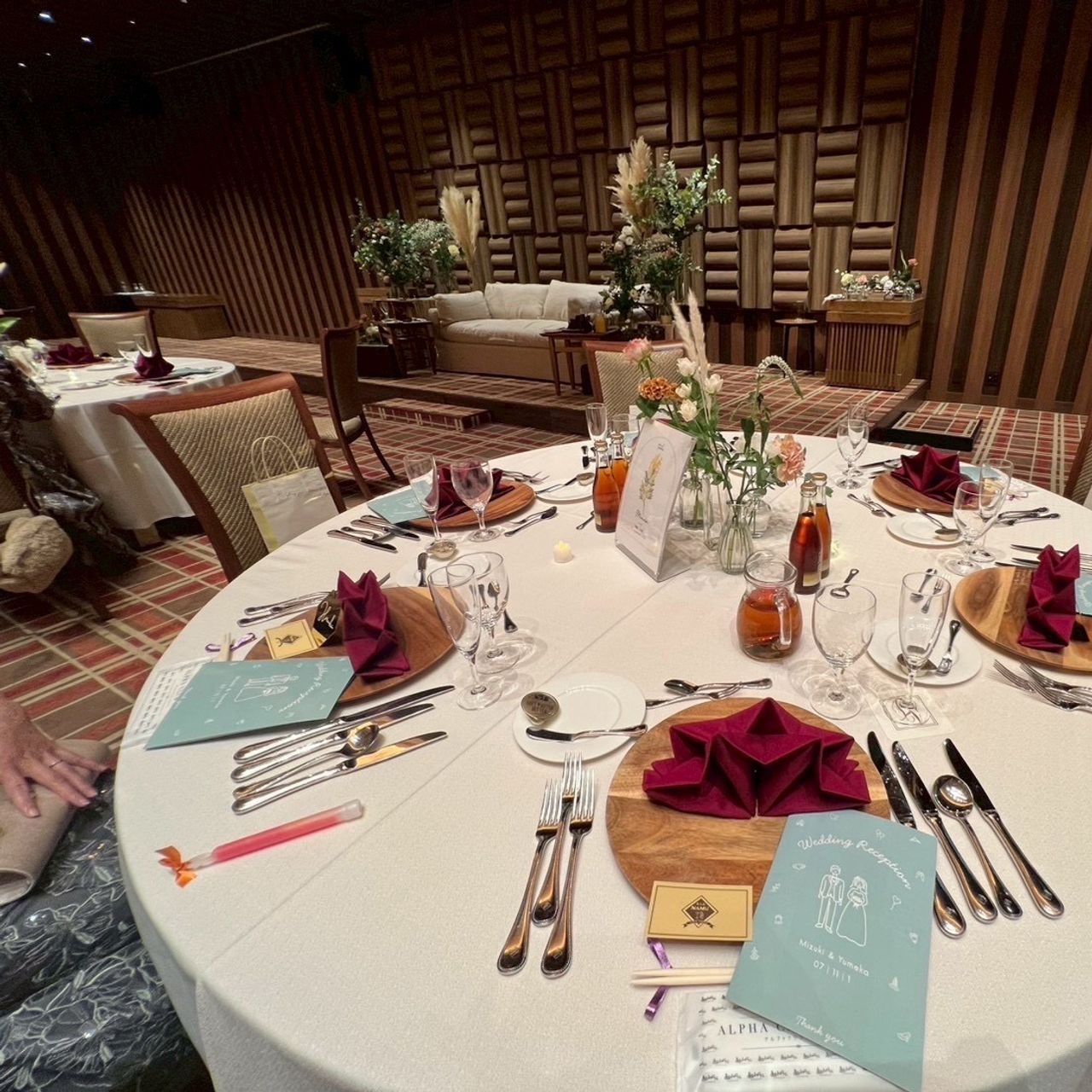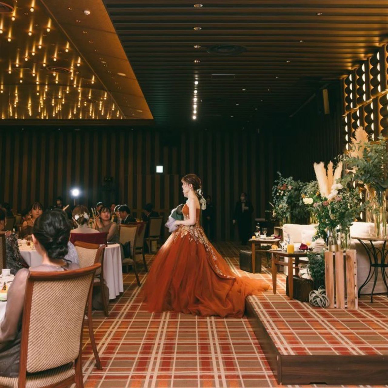 会場の装花は、場内の茶系の色に合わせて緑を加え、パンパスグラスも取り入れて、全体のバランスを調整していただきました。