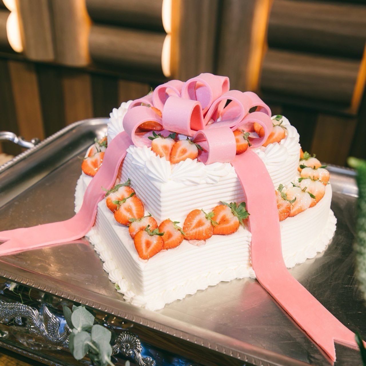 イチゴをたっぷり使い、大きなリボンが飾られた華やかなケーキにしました。