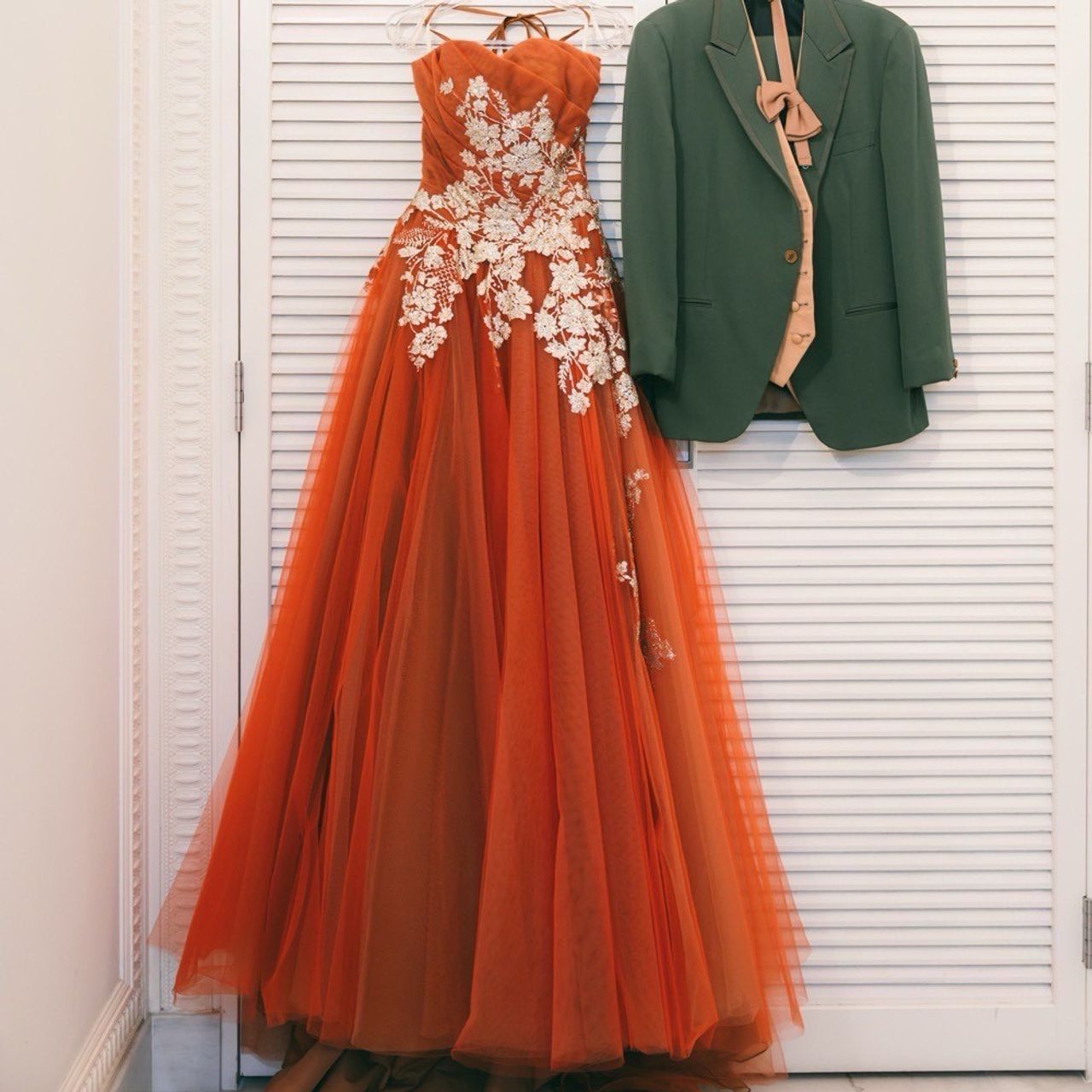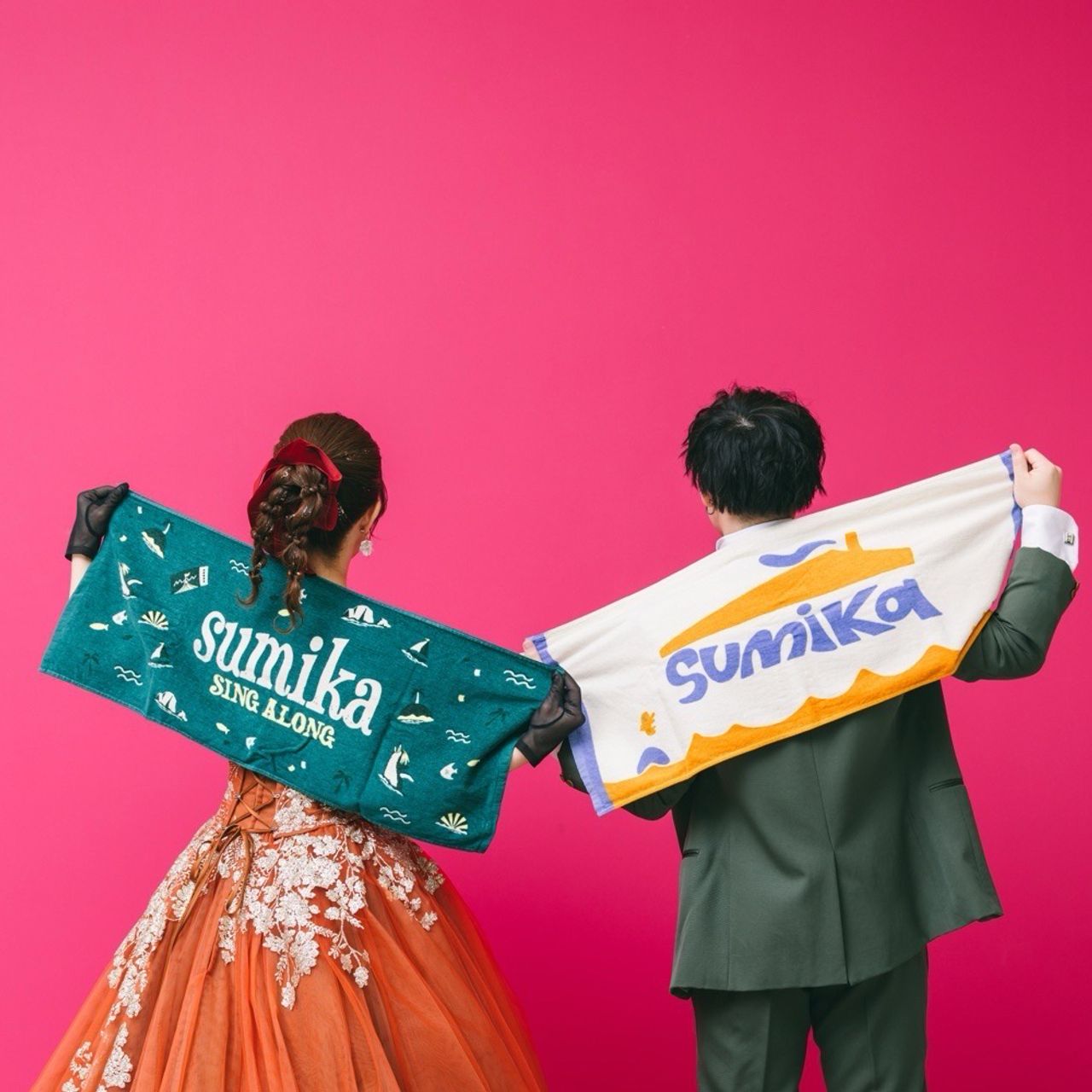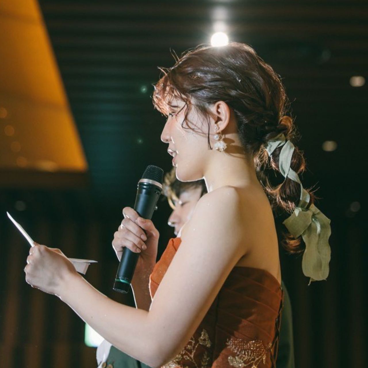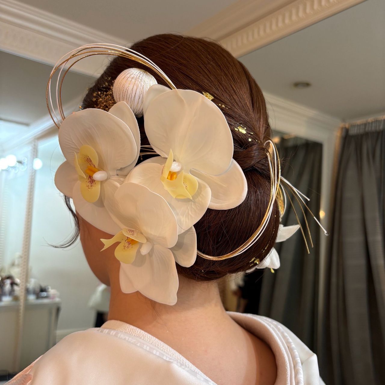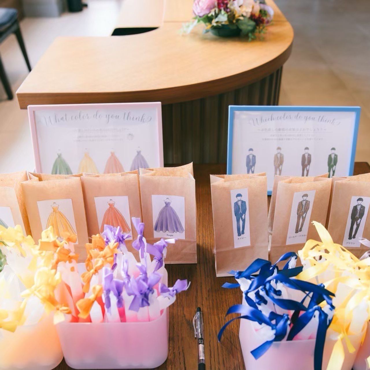 カラードレスでは、夫のタキシードの色に合わせたリボンと金箔を取り入れています。