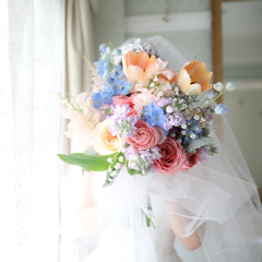 薄いオレンジとピンクの大ぶりのお花をメインに、ブルーや白の小花も取り混ぜた春らしいカラフルな装花をお願いしました。