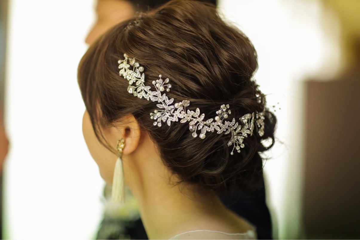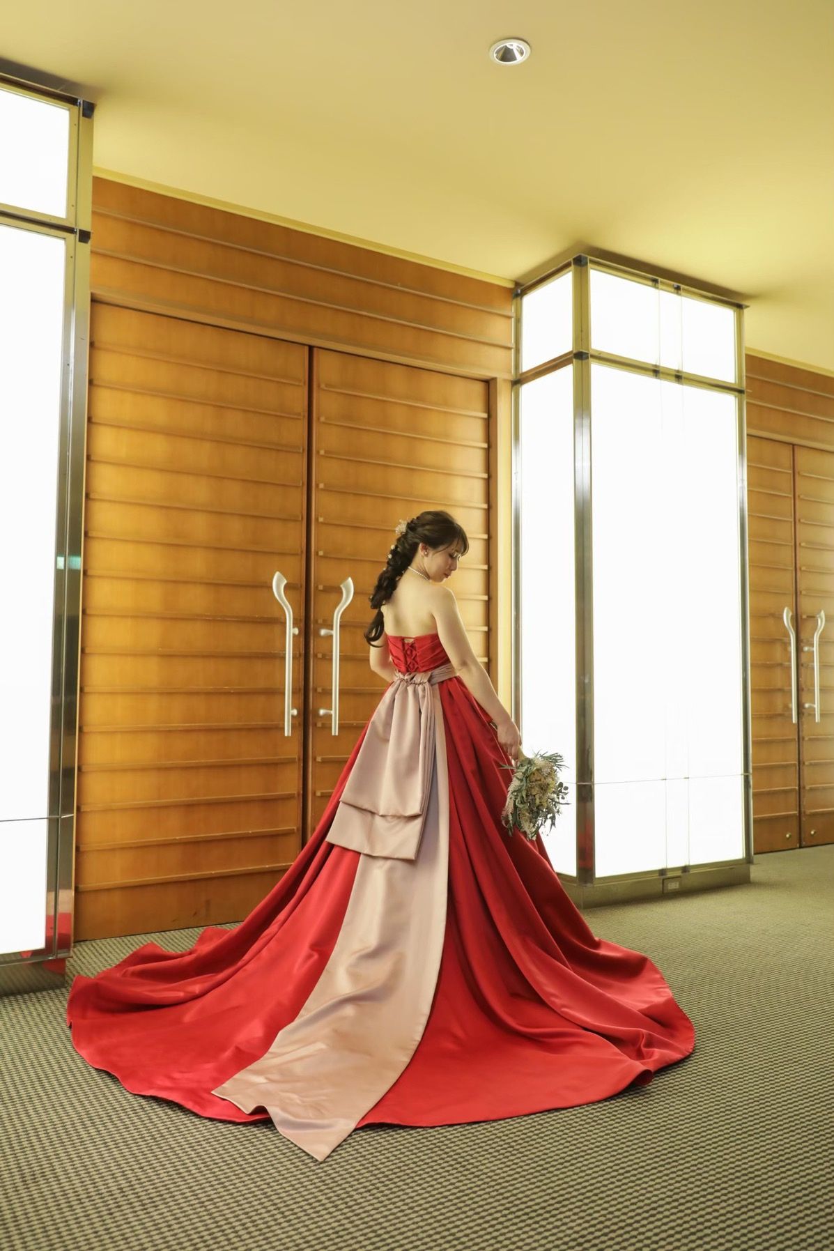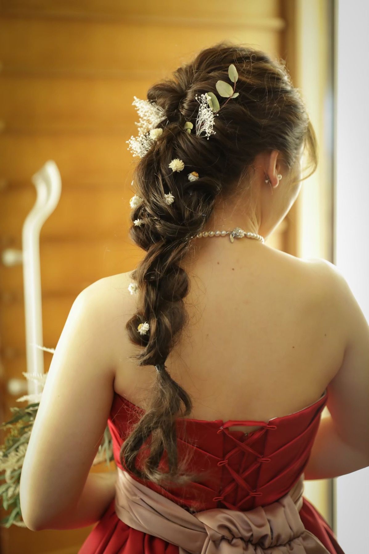 白ドレスには葉っぱをモチーフにしたビーズヘッドアクセ、赤ドレスにはドライフラワーを散りばめました。