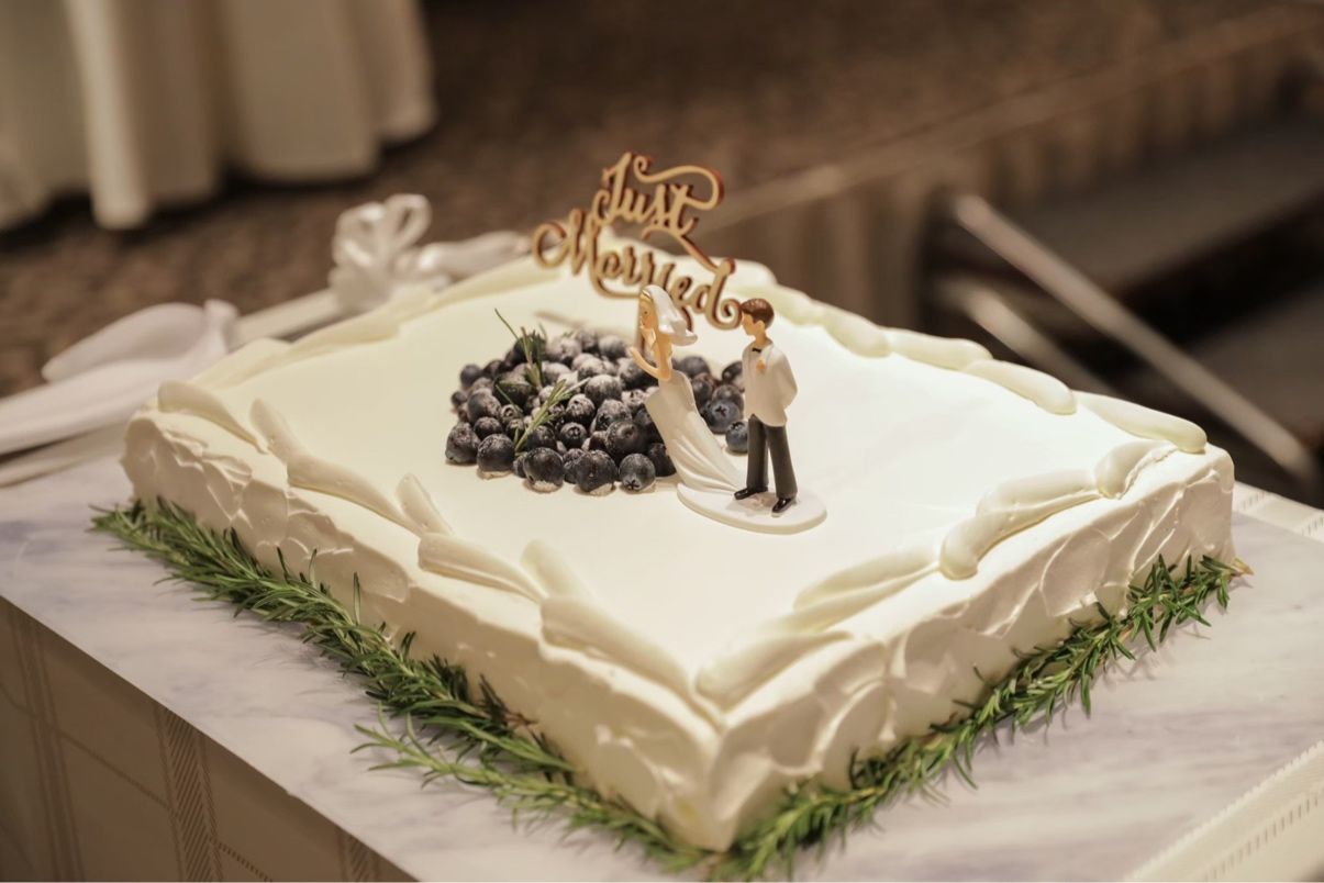 まっ白な四角い一段ケーキにシンプルなトッパーで、ブルーベリーとローズマリーを乗せました。