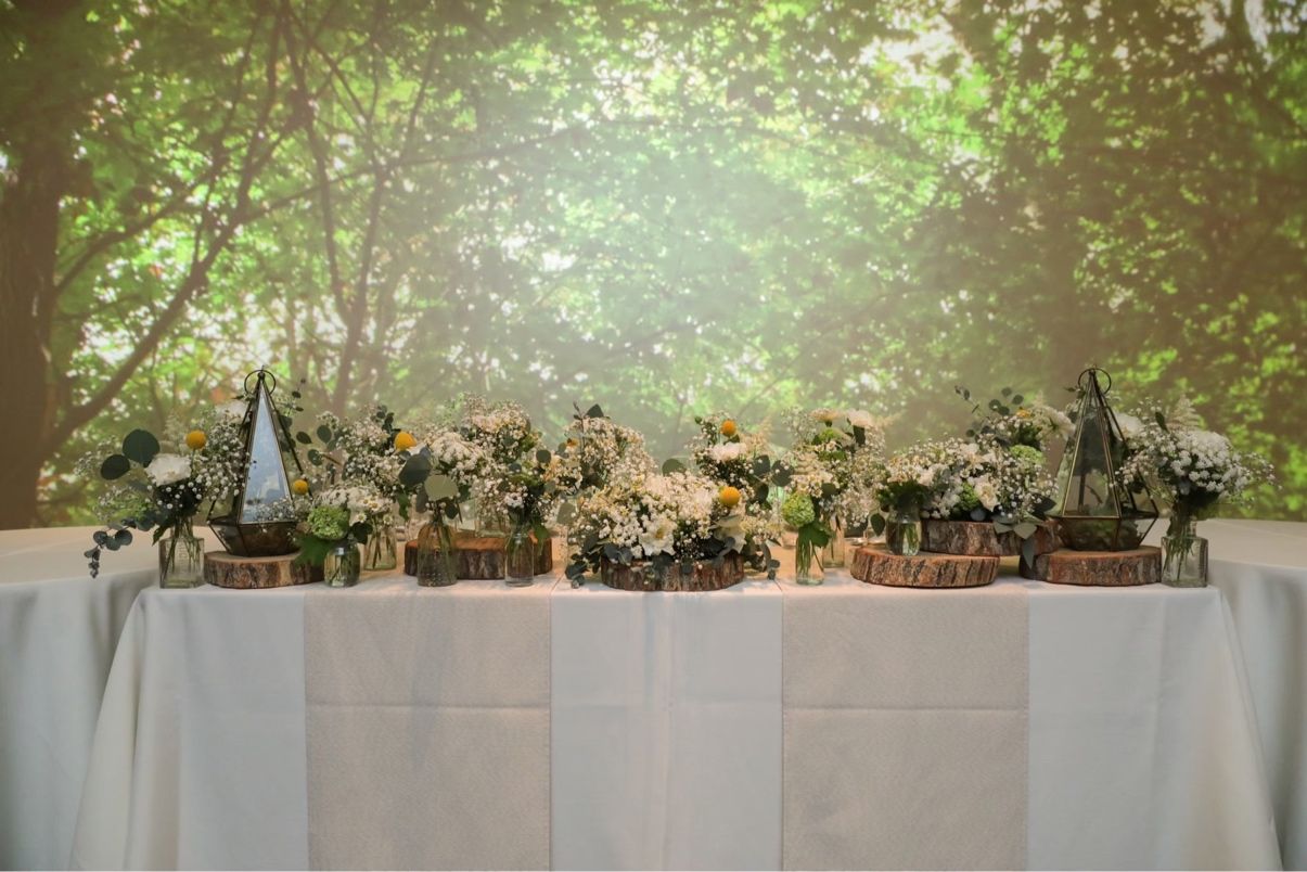 すぐ横にキッチンがあるので、出来立てのお料理をすぐ出していただけます。スクリーンが高砂の後ろにあり、横に長い巨大スクリーンで圧倒されること間違いないです。