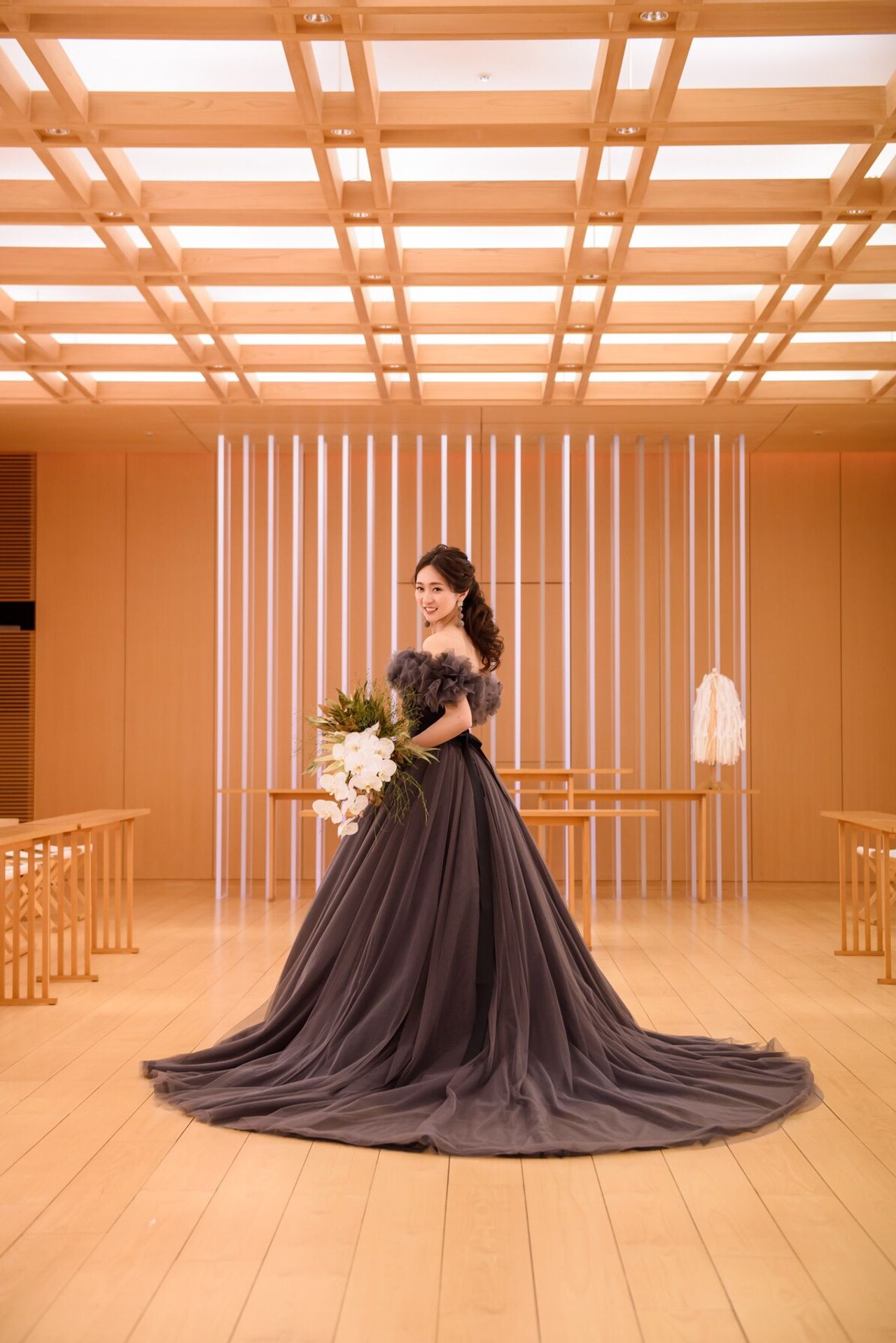 肩のふわふわのファーが本当にかわいい・・・しかしながらカラーはシックなチャコールグレーなので、凛としたカッコよさもあり、テーマとしていた大人婚にぴったりのドレスでした。 正面から見ると露出少な目ですが、バックスタイルは背中がしっかり出るデザインでその点もお気に入りです。