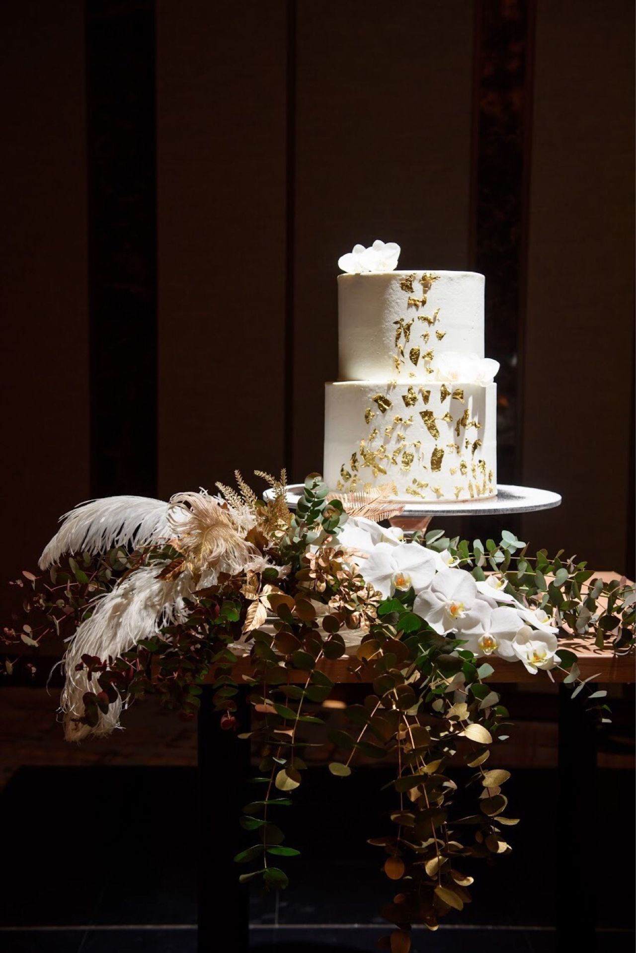 ゴールド要素を入れるために金箔を貼りつけて貰いました。ケーキトッパーは使用せず、代わりにメインのお花である胡蝶蘭をケーキの上に載せてもらいました。