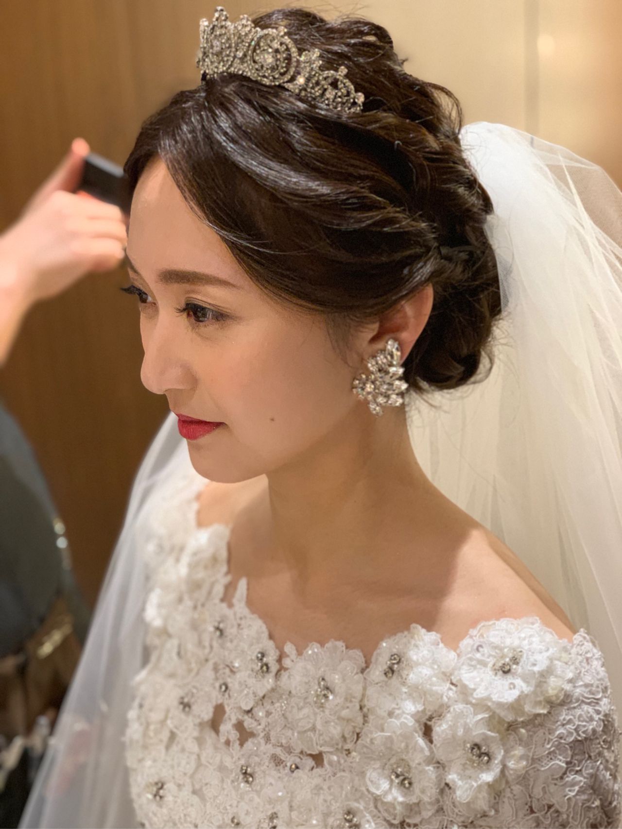 挙式ではティアラとベールを。披露宴ではヘッドアクセサリーはイヤリングとのバランスを考えて使用しませんでした。