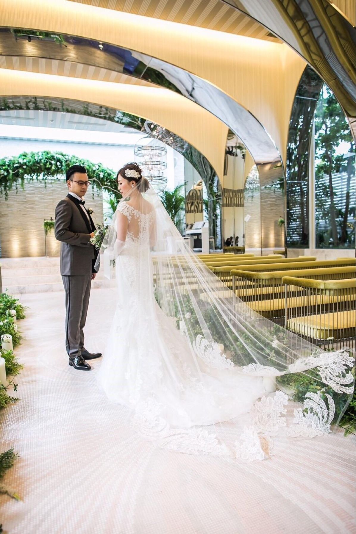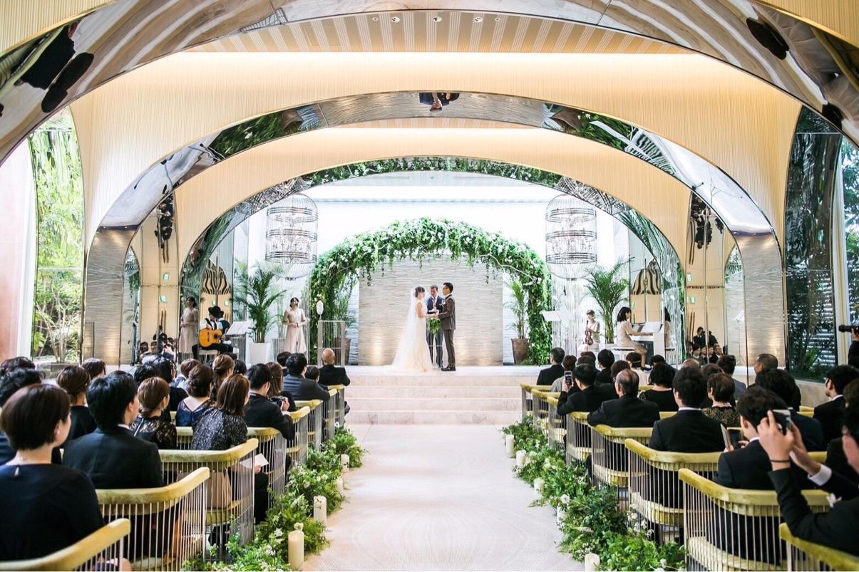挙式の会場は屋内ですが、白ベースにグリーンが多く外の光も入るため天気が悪くなっても明るい印象があります。 神父さんがノリノリな所もポイントです。