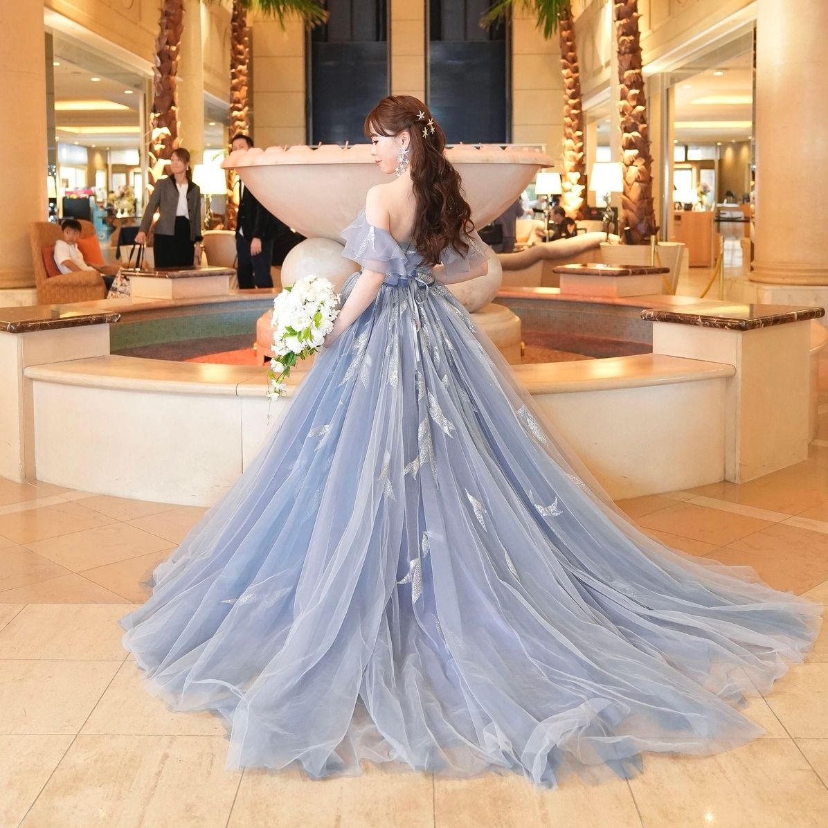 胸元のリボンがとっても可愛く、オフショルダーなのでデコルテが綺麗に見えます。またトレーンが長く、レースやラメで写真映えする点も気に入りました。