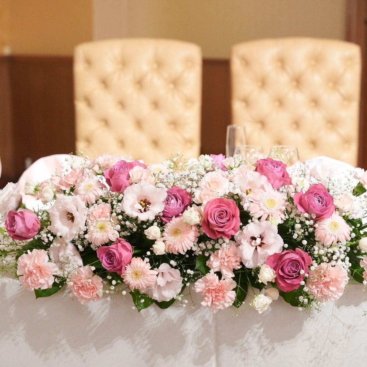 可愛らしいピンクで揃えました。バラでエレガントさもありつつ可愛い装花をイメージしています。