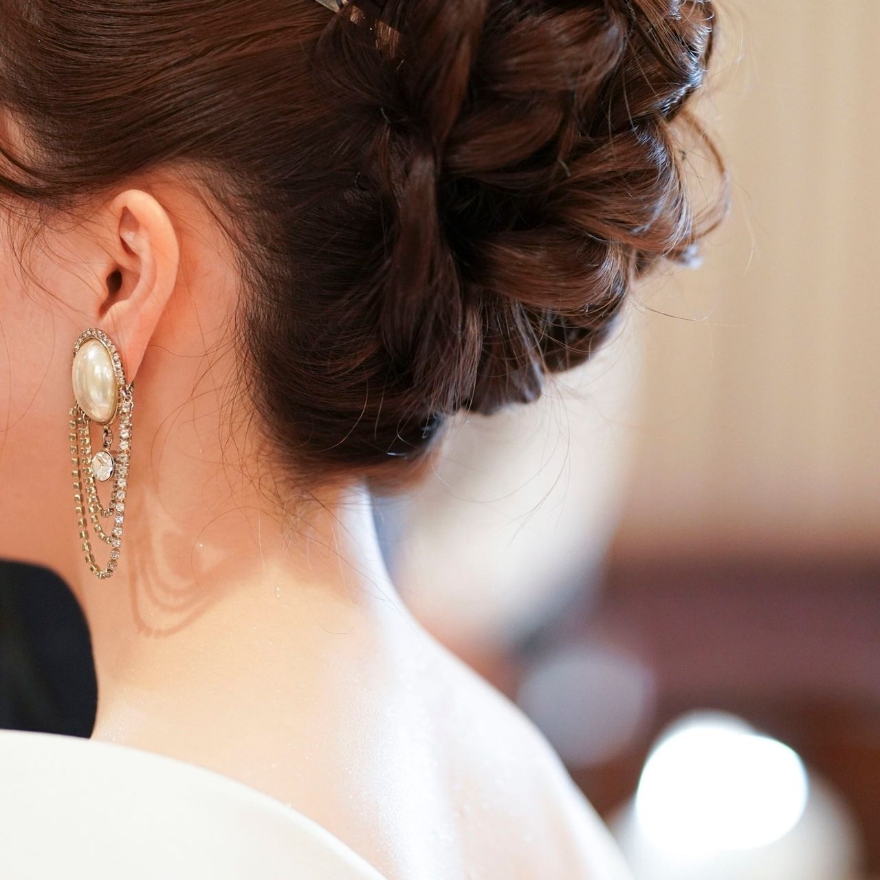 挙式の際は、両親からもらった真珠のピアスで控えめに、披露宴入場からは親戚からご好意で貸してもらった大振りのイヤリングを合わせました。