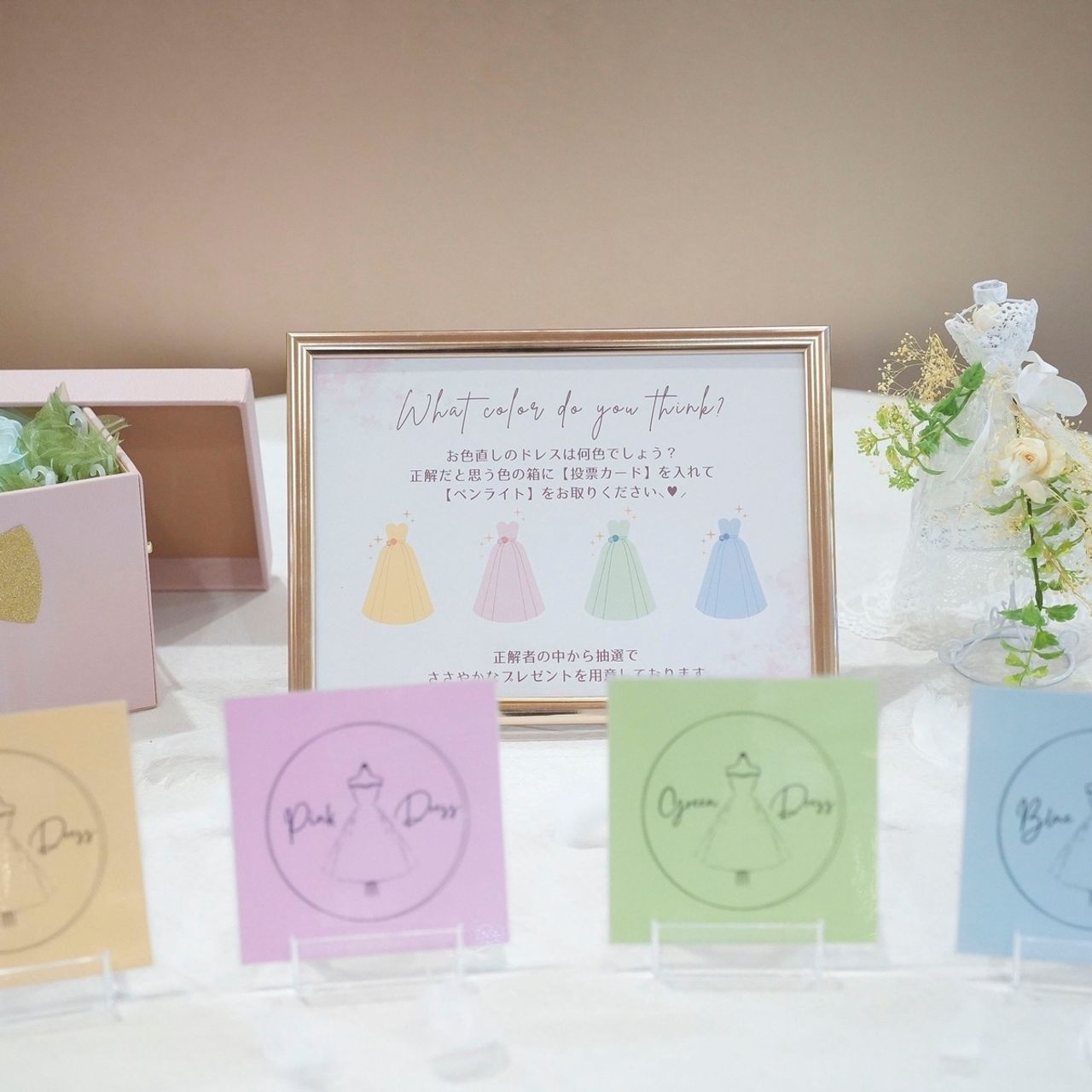 こちらのドレスは旦那さんが私に似合ってるということで決めてくれました。私の好きな色であるピンクではなかったので、ドレスの色当てクイズは大盛り上がりでした。