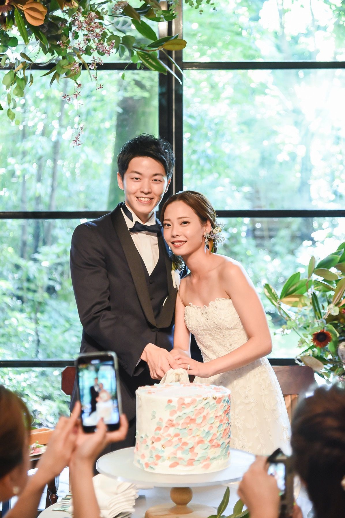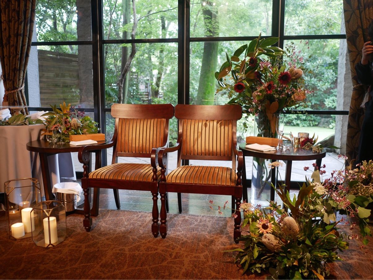 一階の披露宴会場は外のガーデンに繋がっているため、お色直しのサプライズは高砂の後ろのガーデン側から登場することができます。また、高砂の装花を上から吊るすことができるため、とてもお洒落な高砂になりました。