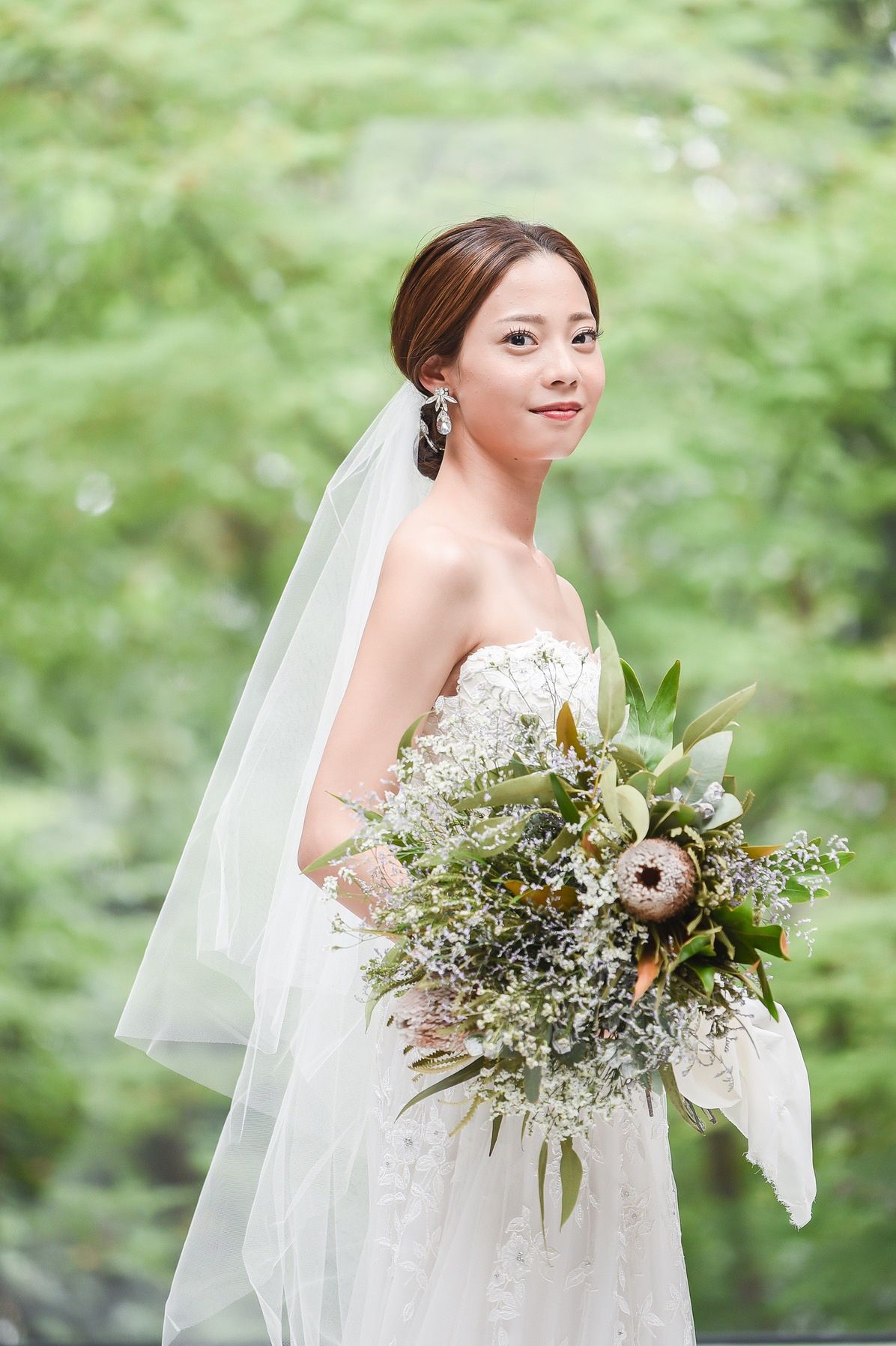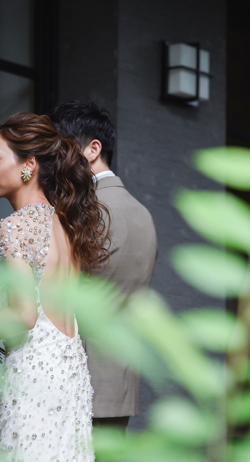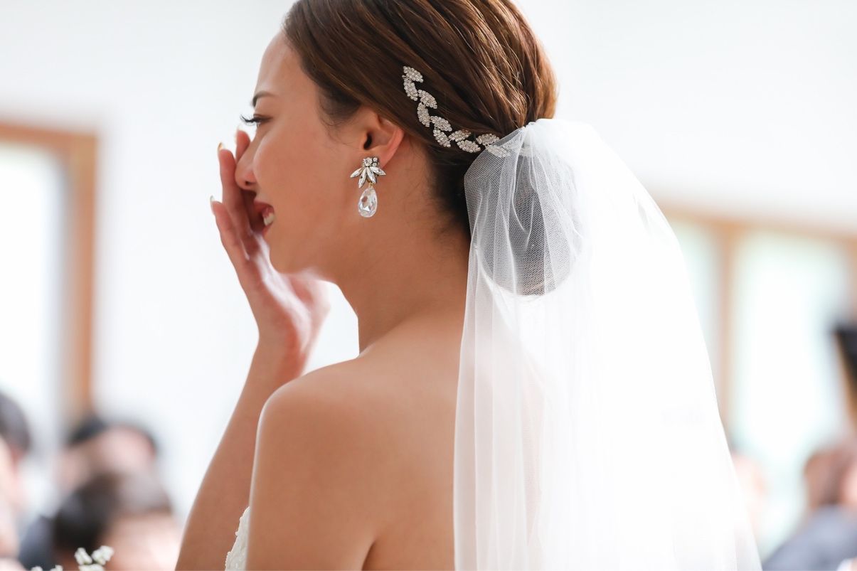 挙式の時にリーフ型のアクセサリーがベールからさりげなく見えるようにつけました。