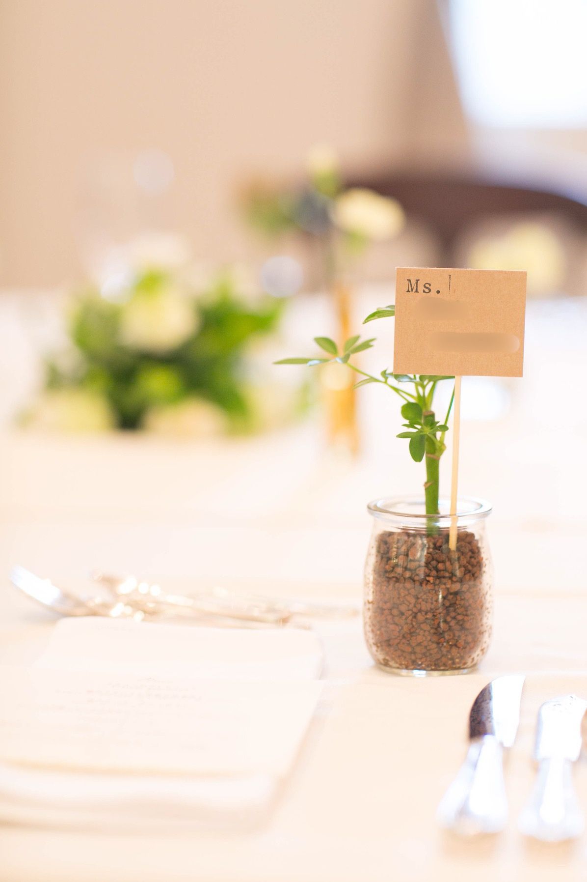カタログギフト、バームクーヘン、席札の観葉植物。